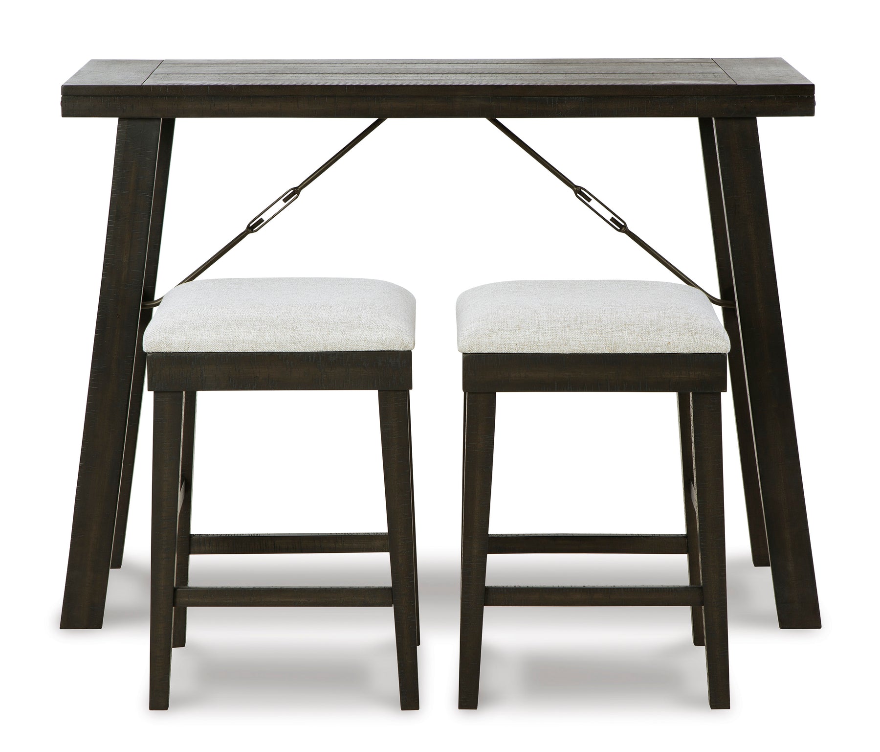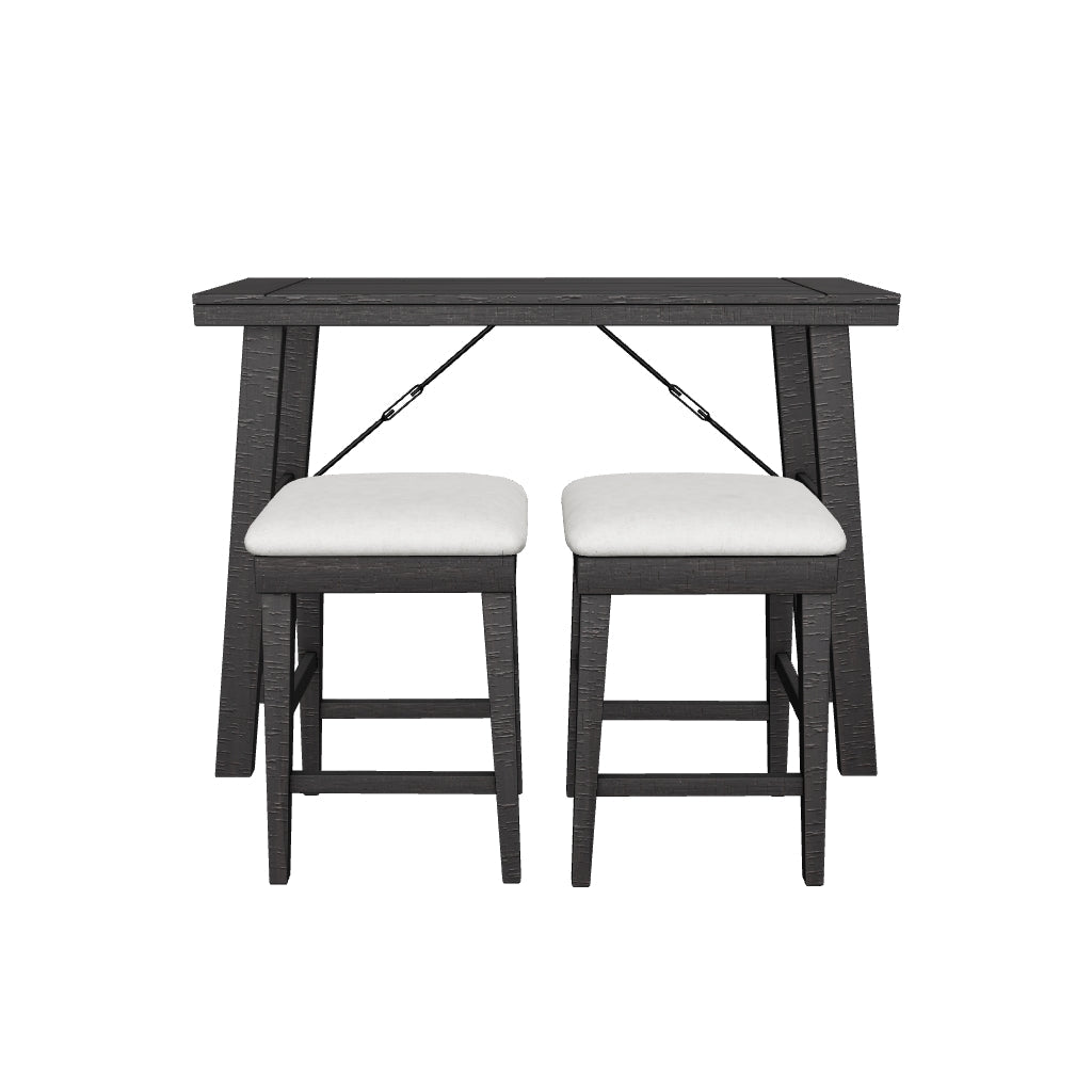 Includes counter height dining table and 2 bar stools;Made with acacia wood, veneer and engineered wood;Distressed black finish;Polyester upholstery;Foam cushions;Decorative metal tension bar;Nailhead accents;Assembly required