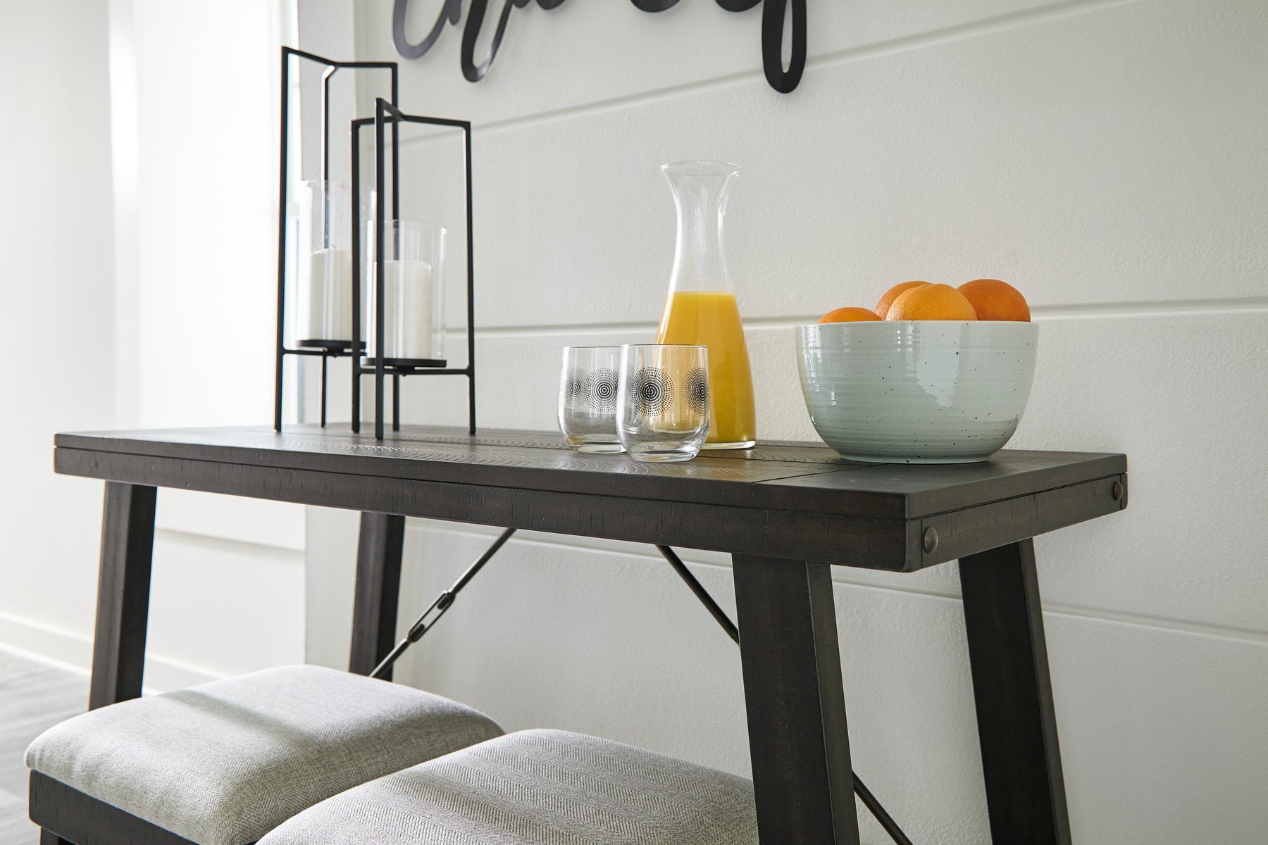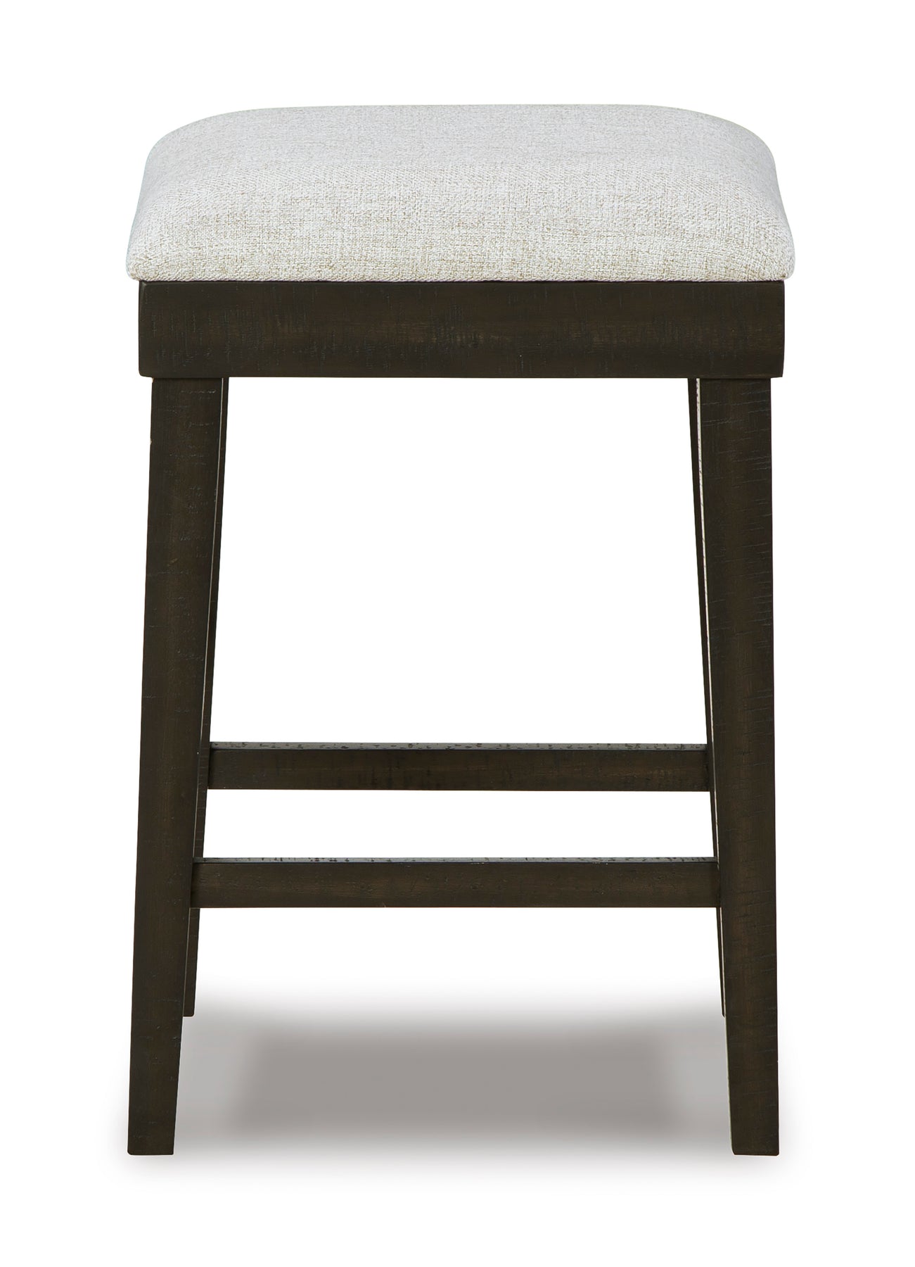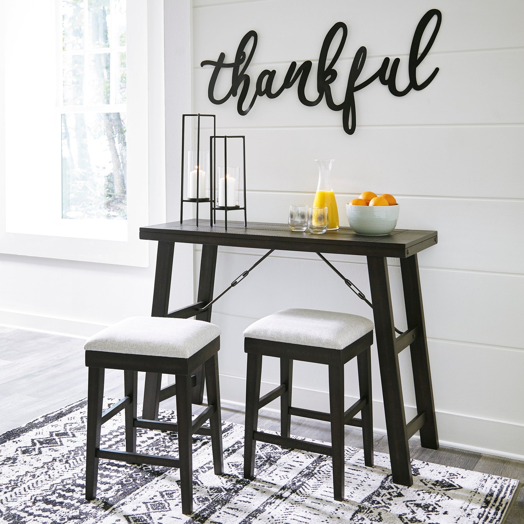 Impress with the chic, casual stylings of the Noorbrook counter height dining set. Its distressed black finish has a neutral appeal, while linen-colored upholstery brings visual balance. Decorative tension bars and nailhead accents punctuate the effortlessly beautiful design.