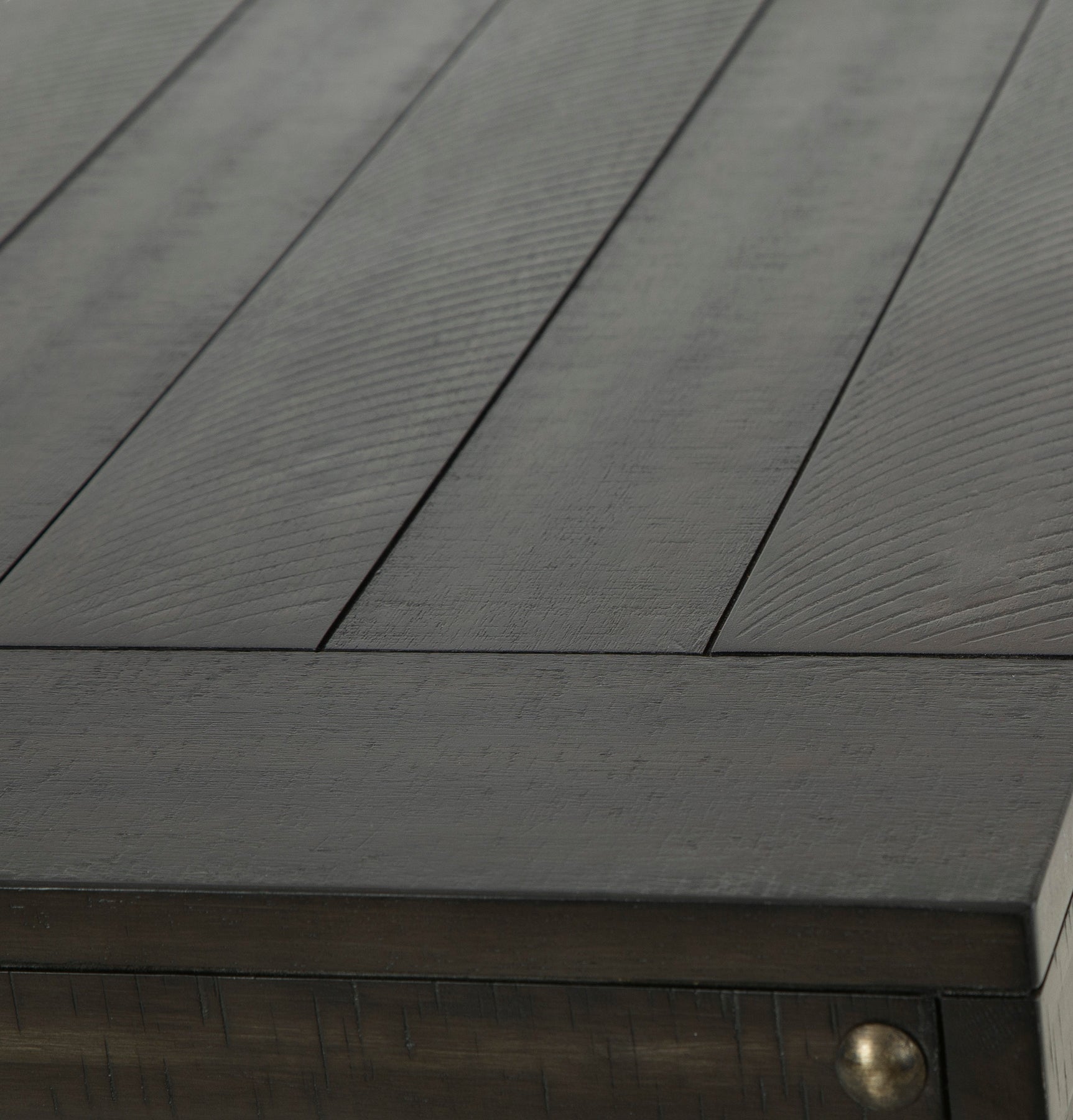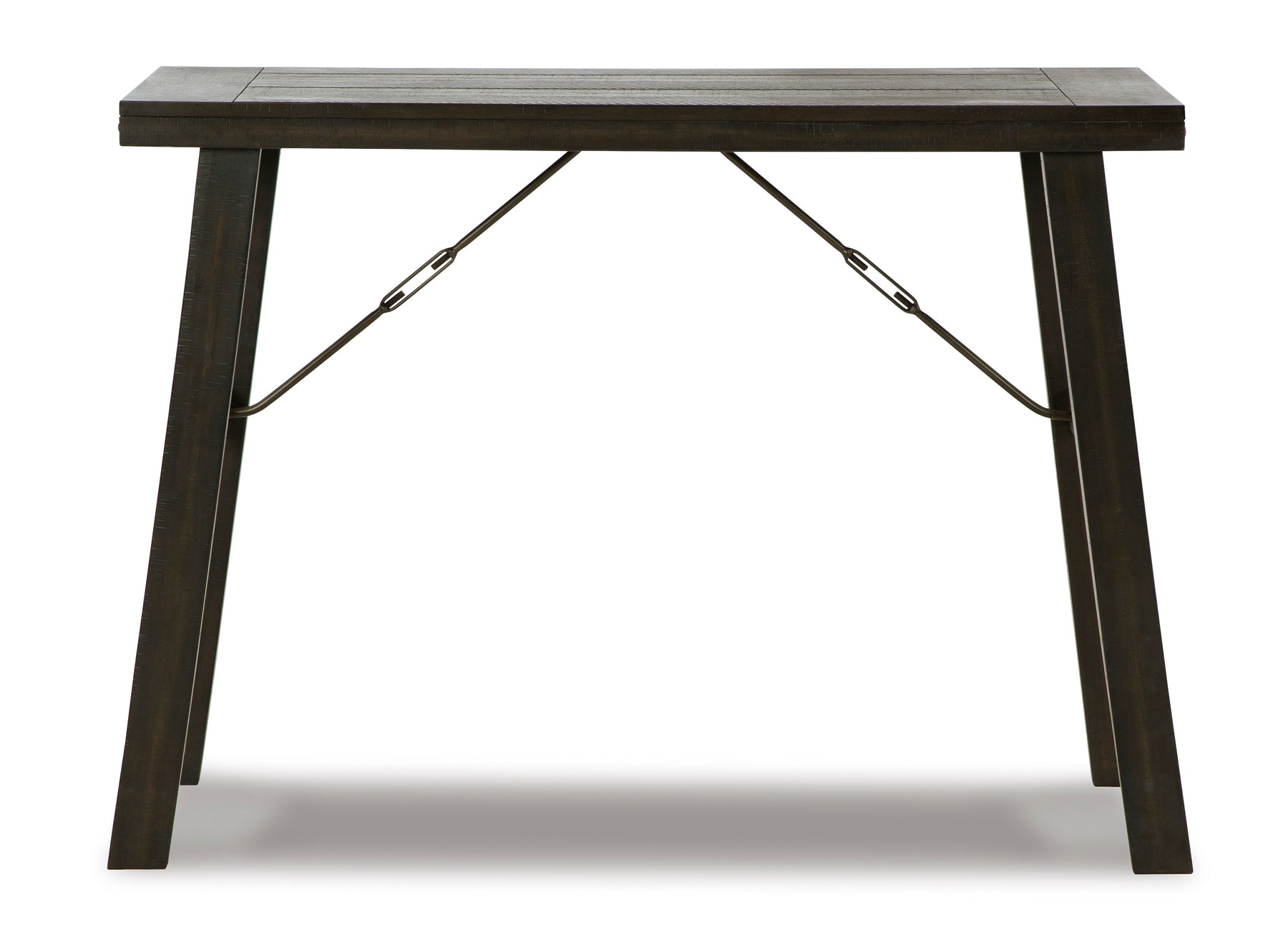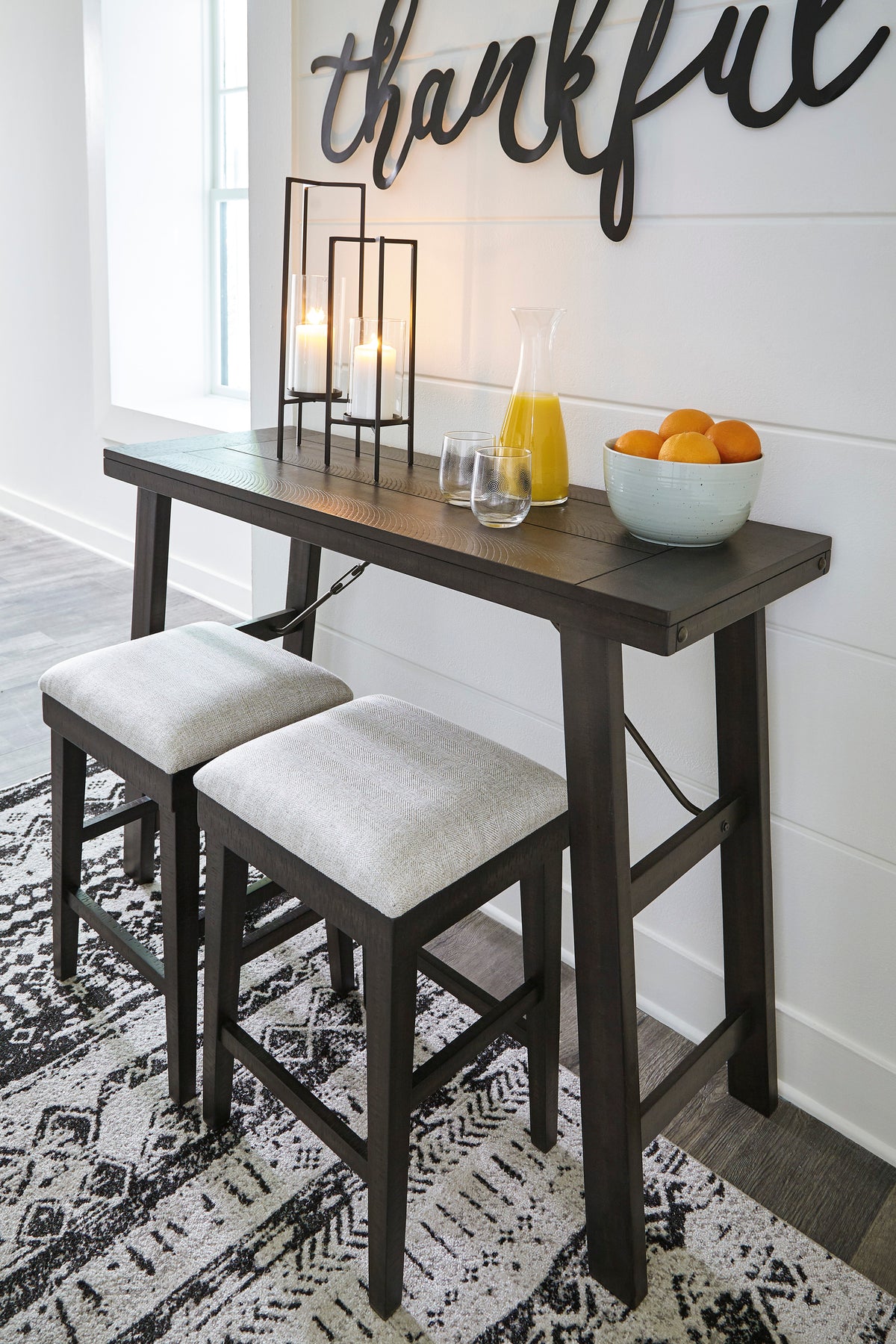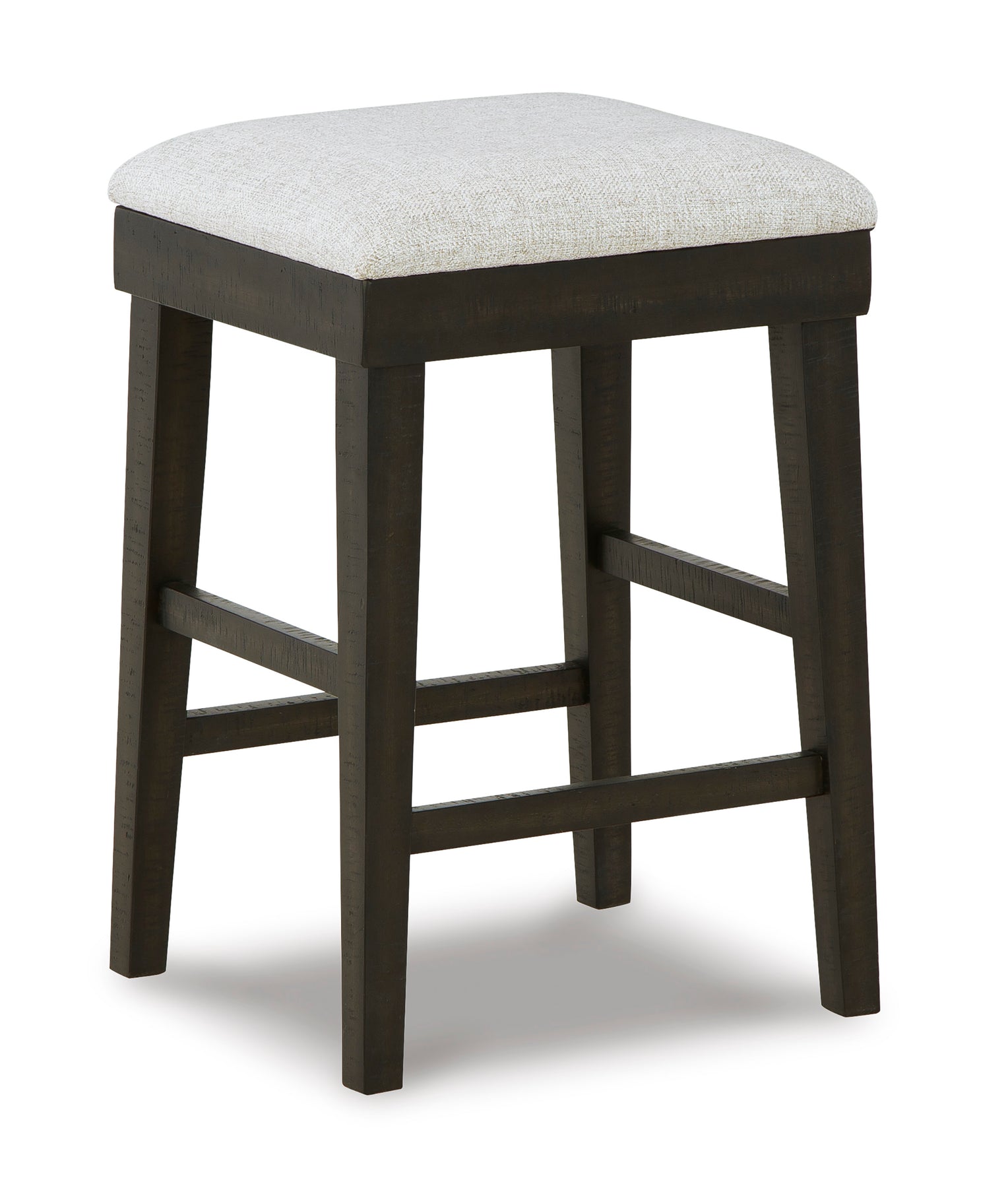 Impress with the chic, casual stylings of the Noorbrook counter height dining set. Its distressed black finish has a neutral appeal, while linen-colored upholstery brings visual balance. Decorative tension bars and nailhead accents punctuate the effortlessly beautiful design.