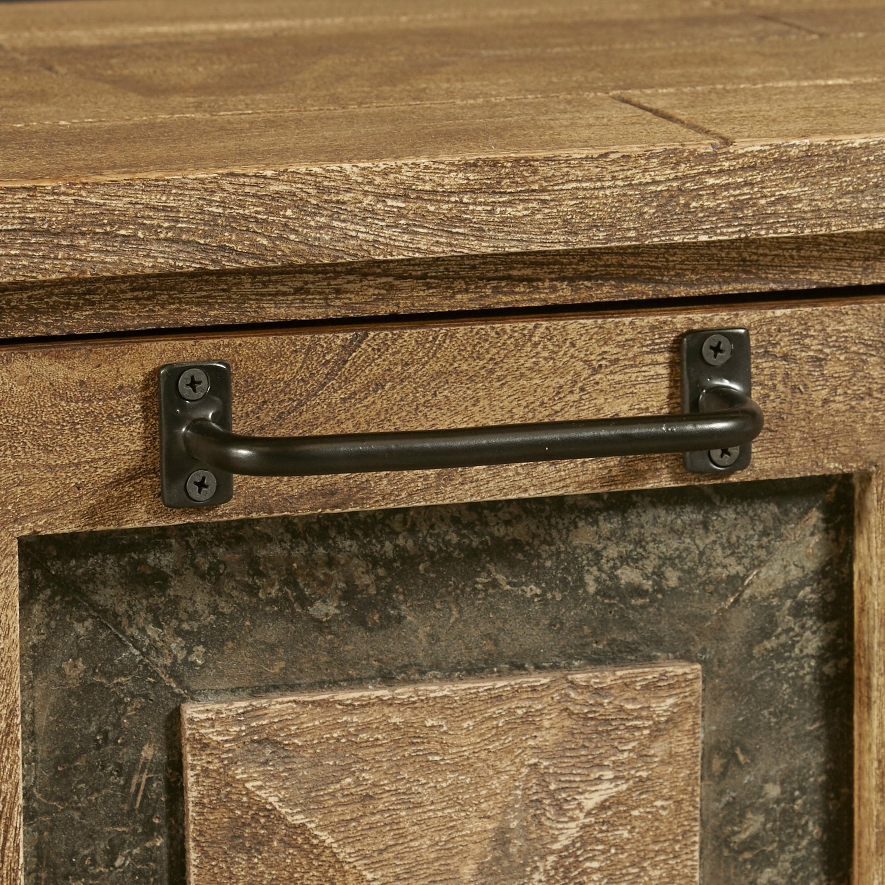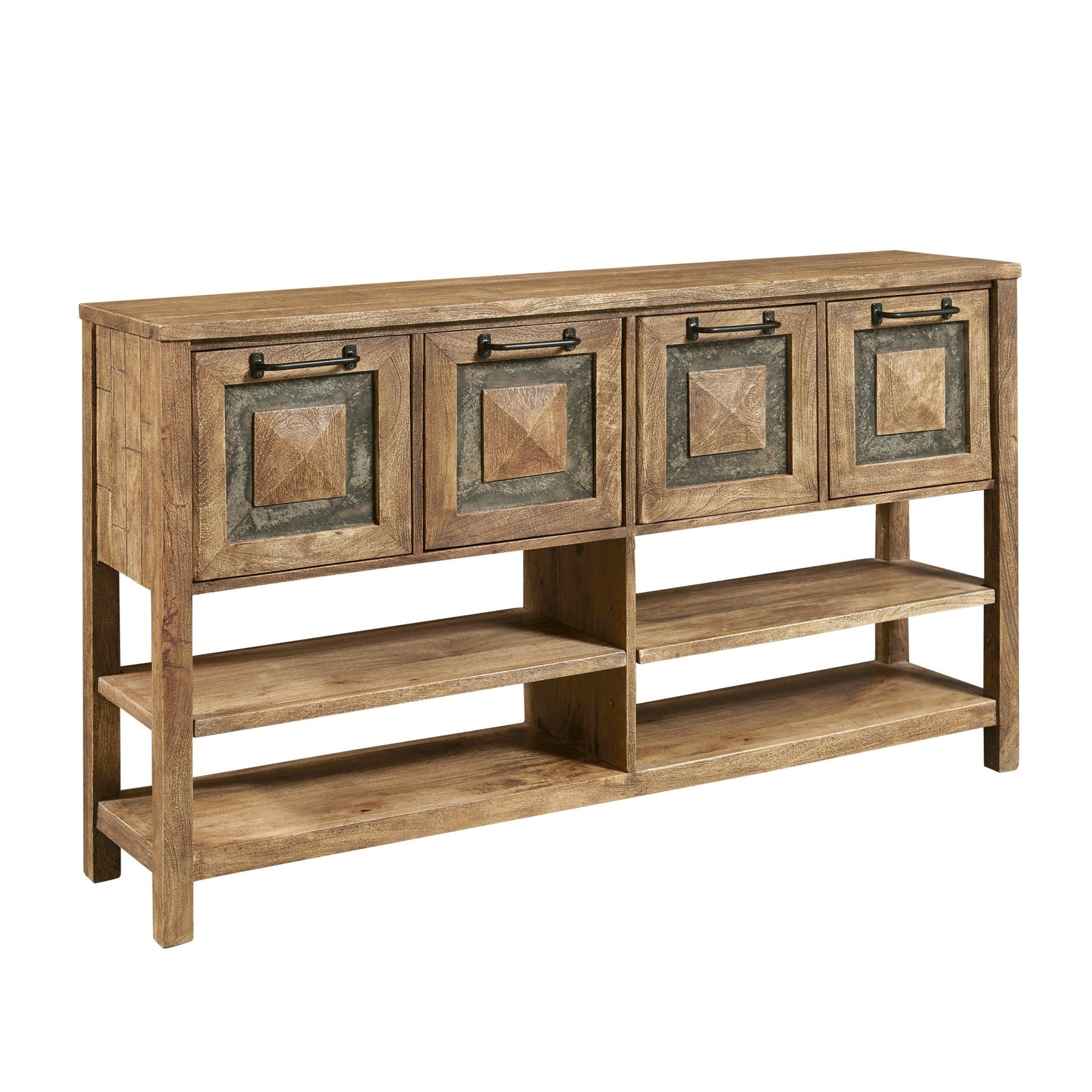 This versatile mixed-medium content adds functionality and design to multiple areas of your home,Four doors open to ample room for storing books, media, and more.,Rustic acacia finish features light brown tones and is accented with stone veneer accents,Over sized hand-forged iron hardware,Constructed with wire-brushed and sandblasted solid acacia with stone veneer accents.,Assembly is required; hardware kit and instructions included.