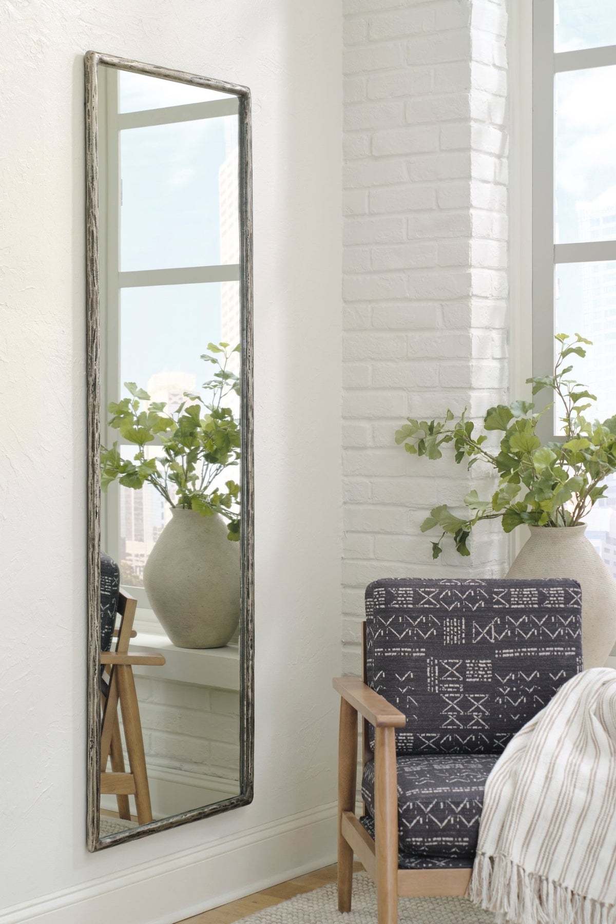 Classic in design with a dash of textural appeal, the Ryandale floor mirror brings reflective light to your space. An antiqued pewter-tone finish has a chic, distressed look that remains versatile, suiting spaces from casual to contemporary.