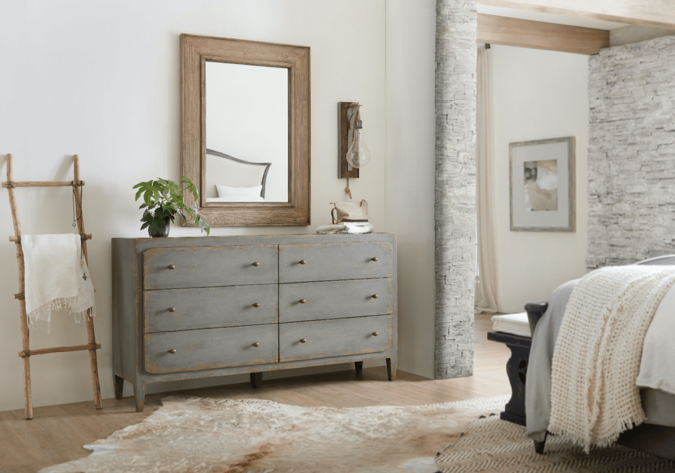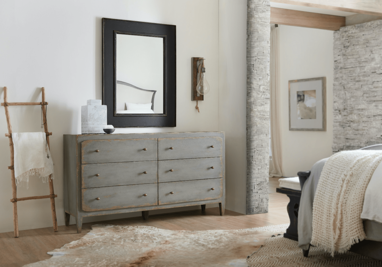 Rustic and romantic, the six-drawer Cia Bella dresser will bring a European farmhouse ambience to your room. Crafted of Poplar and Hardwood Solids with Maple Veneer, the Time Worn Gray finish has multi-layered rub-through and is filled with character. The top 2 drawers have a drop-in felt liner, the bottom drawers are cedar-lined and there is a sliding/removable jewelry tray in the top right drawer.