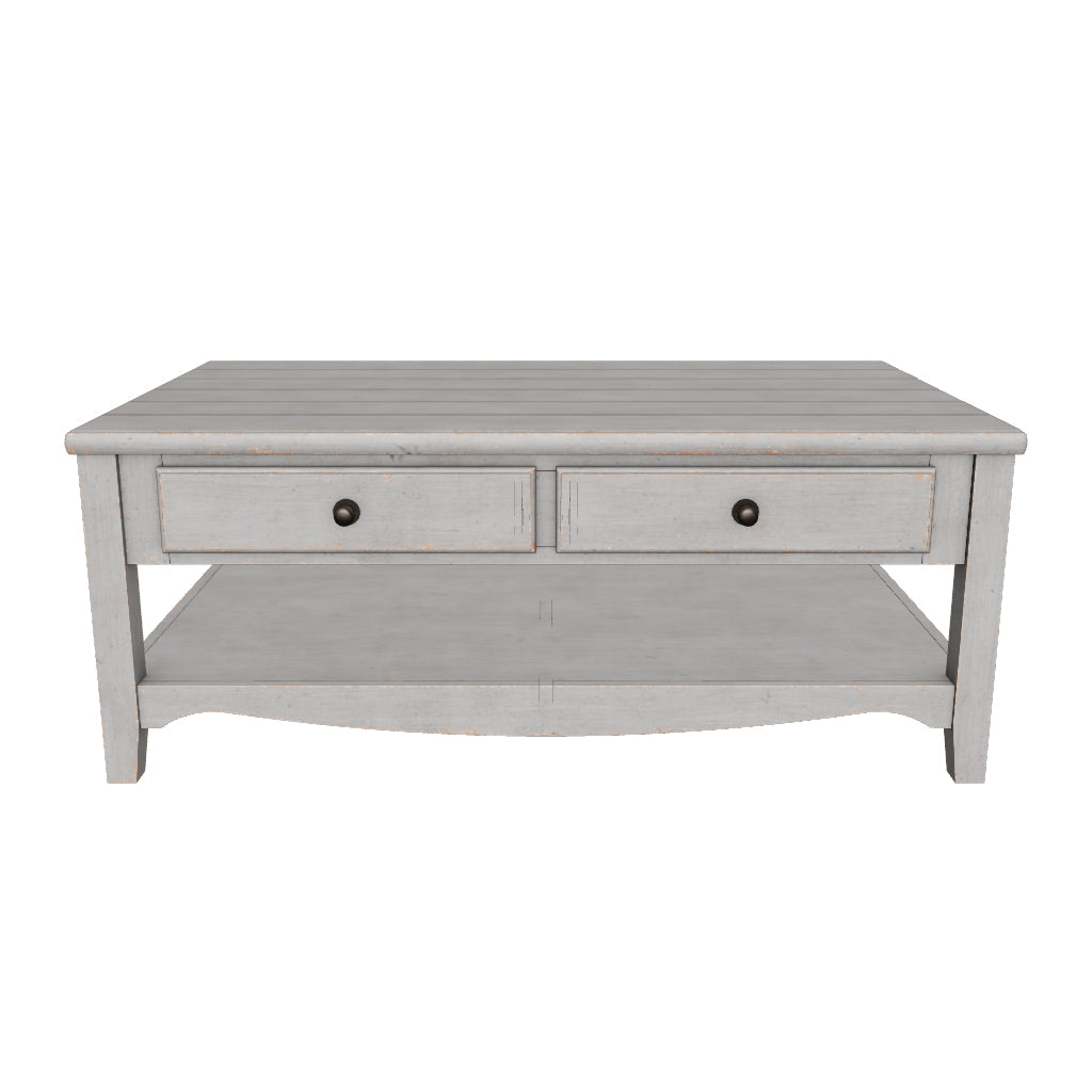 Put your love of European farmhouse styling on display. Finished with an antiqued gray chipped paint effect for an authentic vintage look, the Charina coffee table is loaded with character. Two drawers and an open display shelf allow for storage and easy access to books, beverages and more.