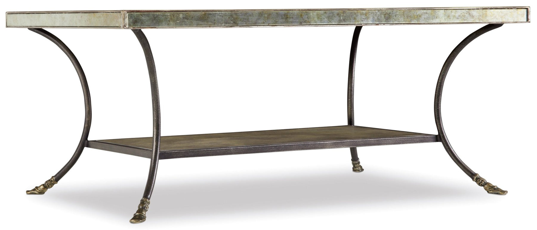 Bold and dramatic yet light and airy, the Sanctuary Lisette Cocktail Table is a couture combination of Oak Veneers and glass, blending the silver Jewel finish with rich undertones of gold and champagne with Metal Noir, a dark antiqued metal, accented with a glimmering eglomise.