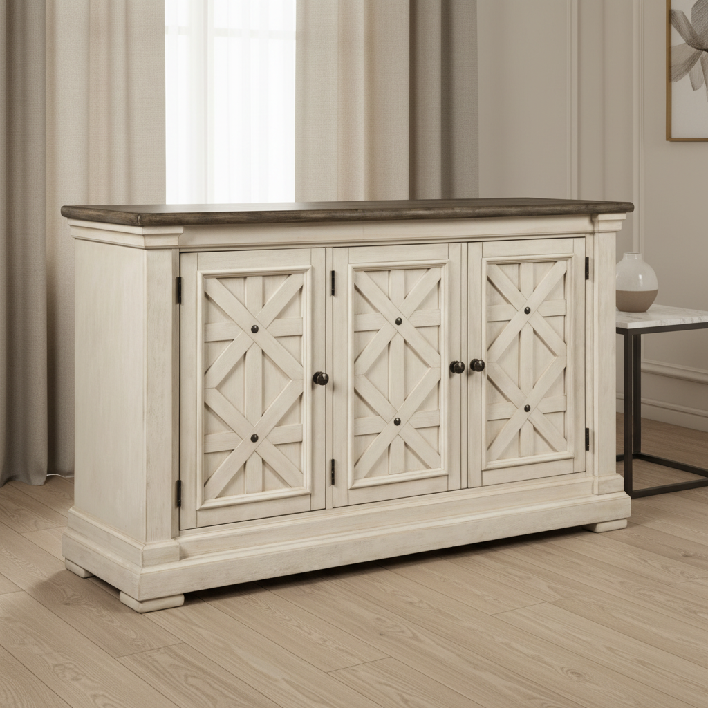 Need a stylish space to store dinnerware and all your dining room essentials? The Bolanburg server is a dream come true with four adjustable shelves that offer large capacity and a spacious top that's perfect for setting a buffet. Embellished with the casual appeal of three latticed doors, an attractive planked top with weathered oak finish and a lightly distressed white finish throughout, this vintage look will serve up elegance for years to come.