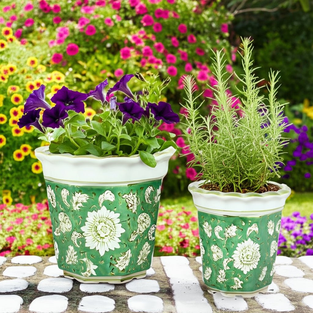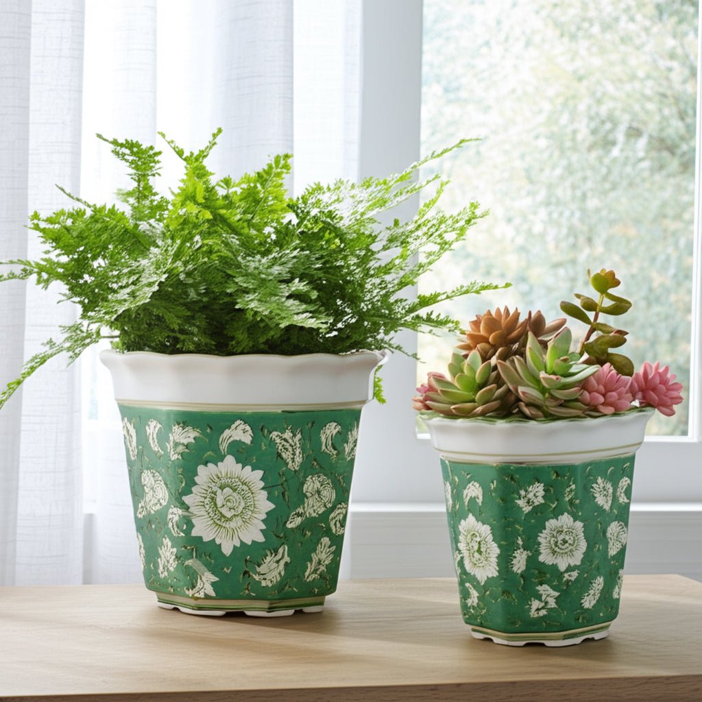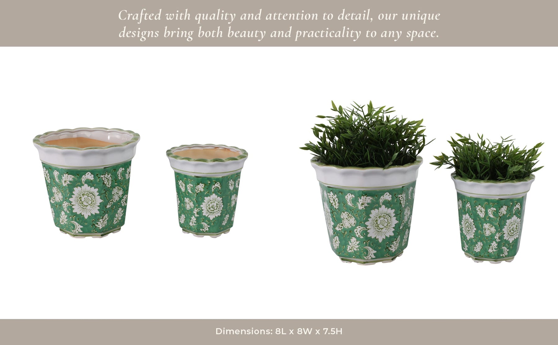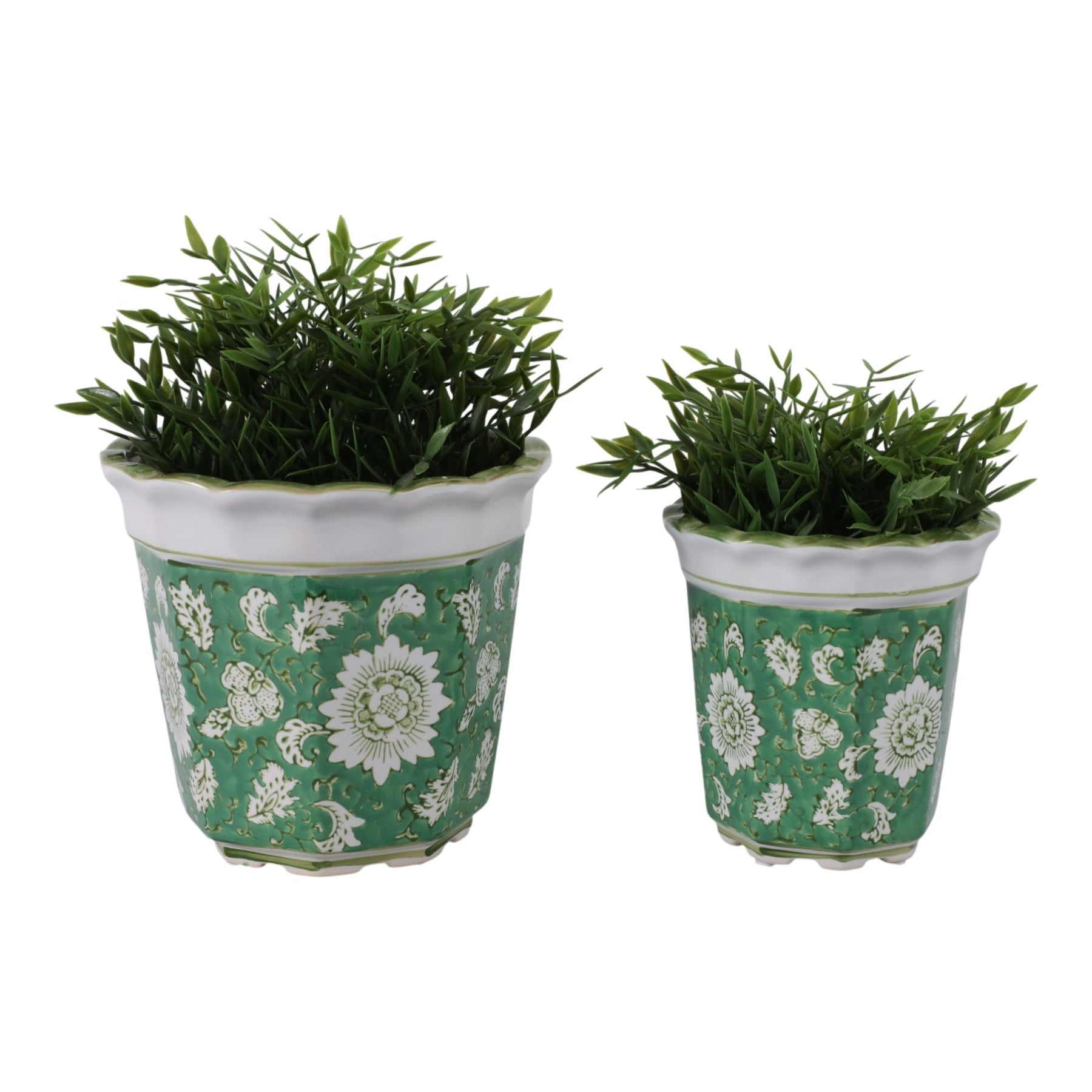 S/2 6/8" Flower & Vine Chinoiserie Planters, Green