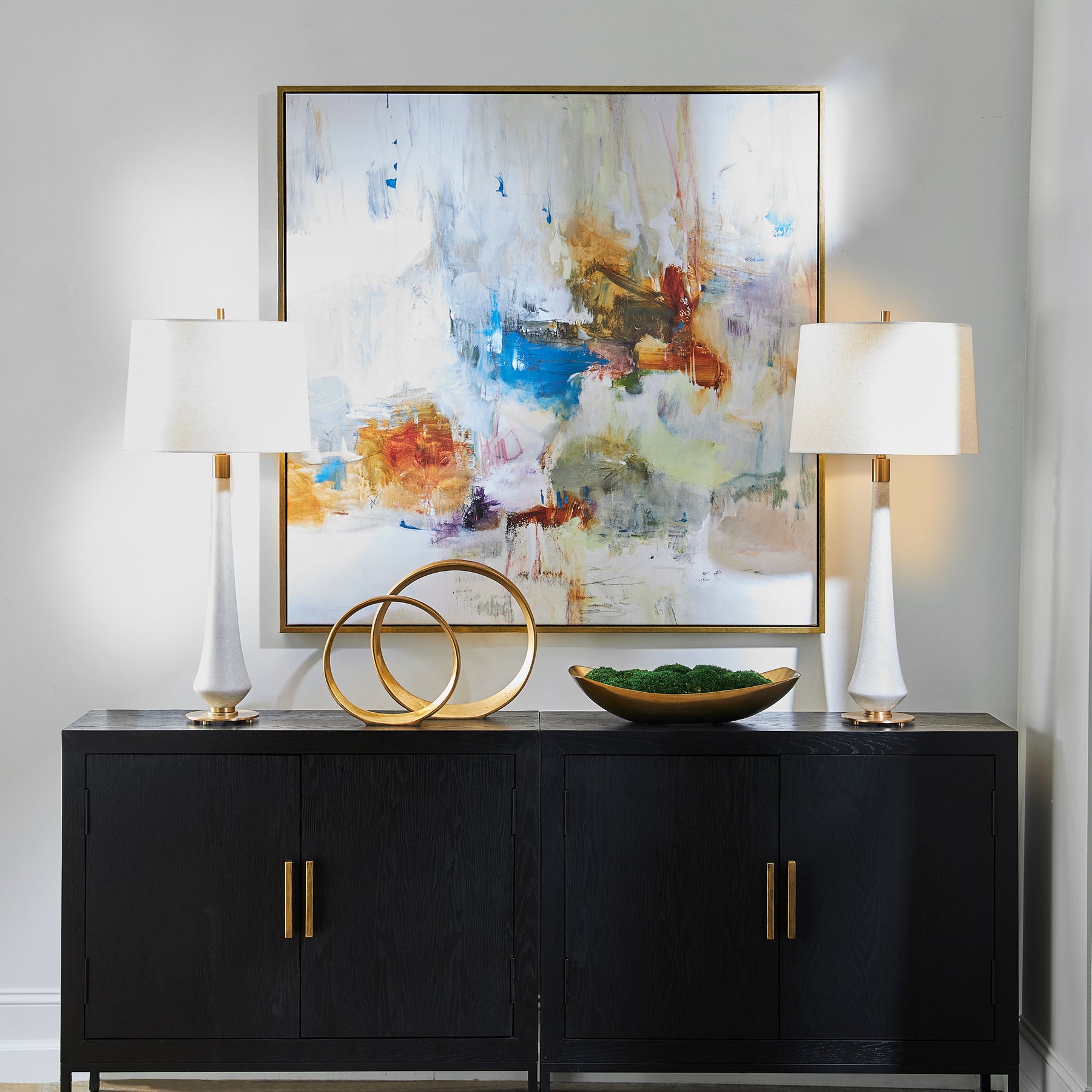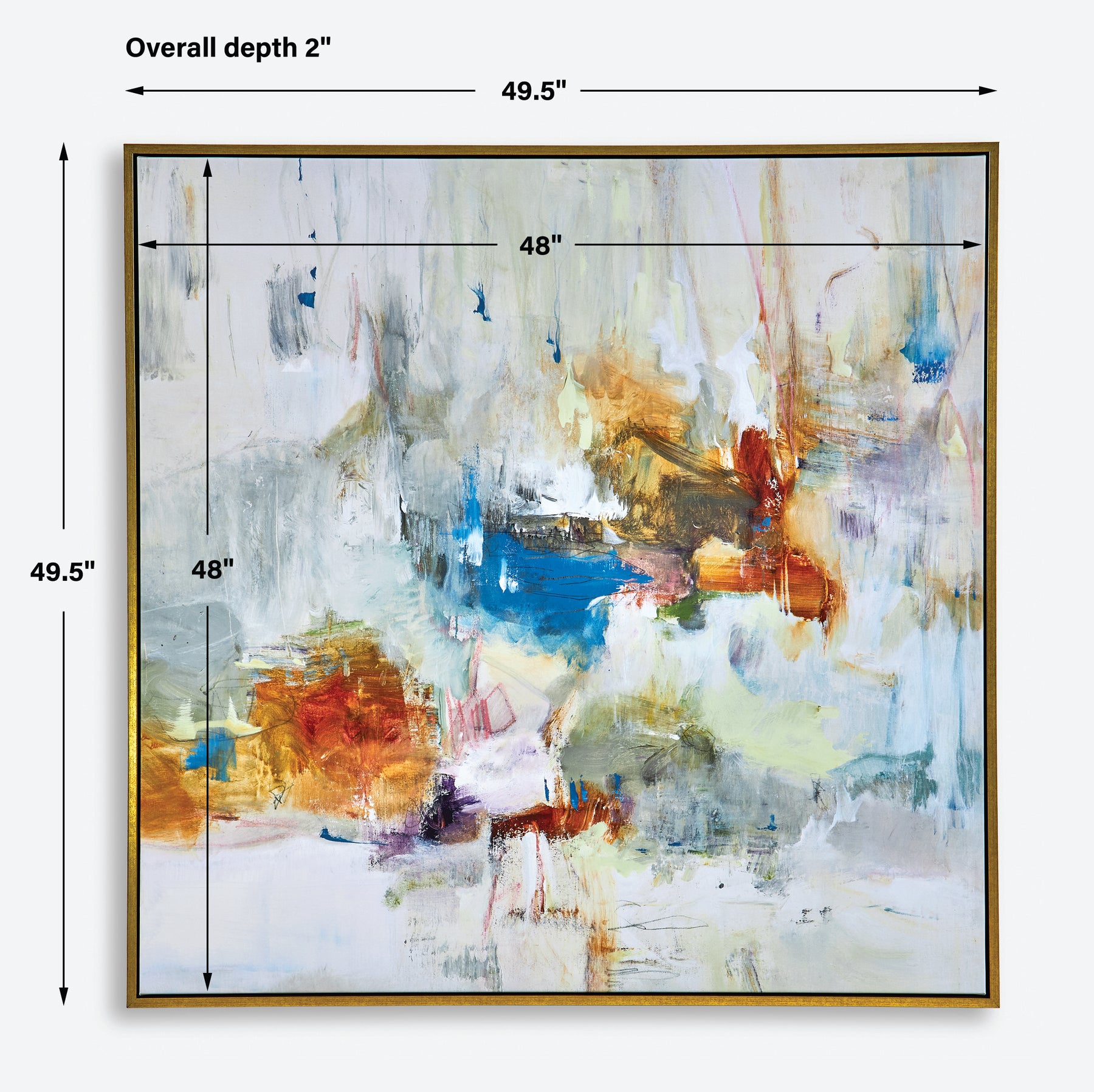This abstract interpretation features shades of burnt orange, teal, and umber popping off a gray and cream background. Surrounded by a solid wood gallery frame with gold finish, this piece may be hung horizontal or vertical. Each canvas is proudly handcrafted and printed in the USA. Artwork by Lisa Ridgers.