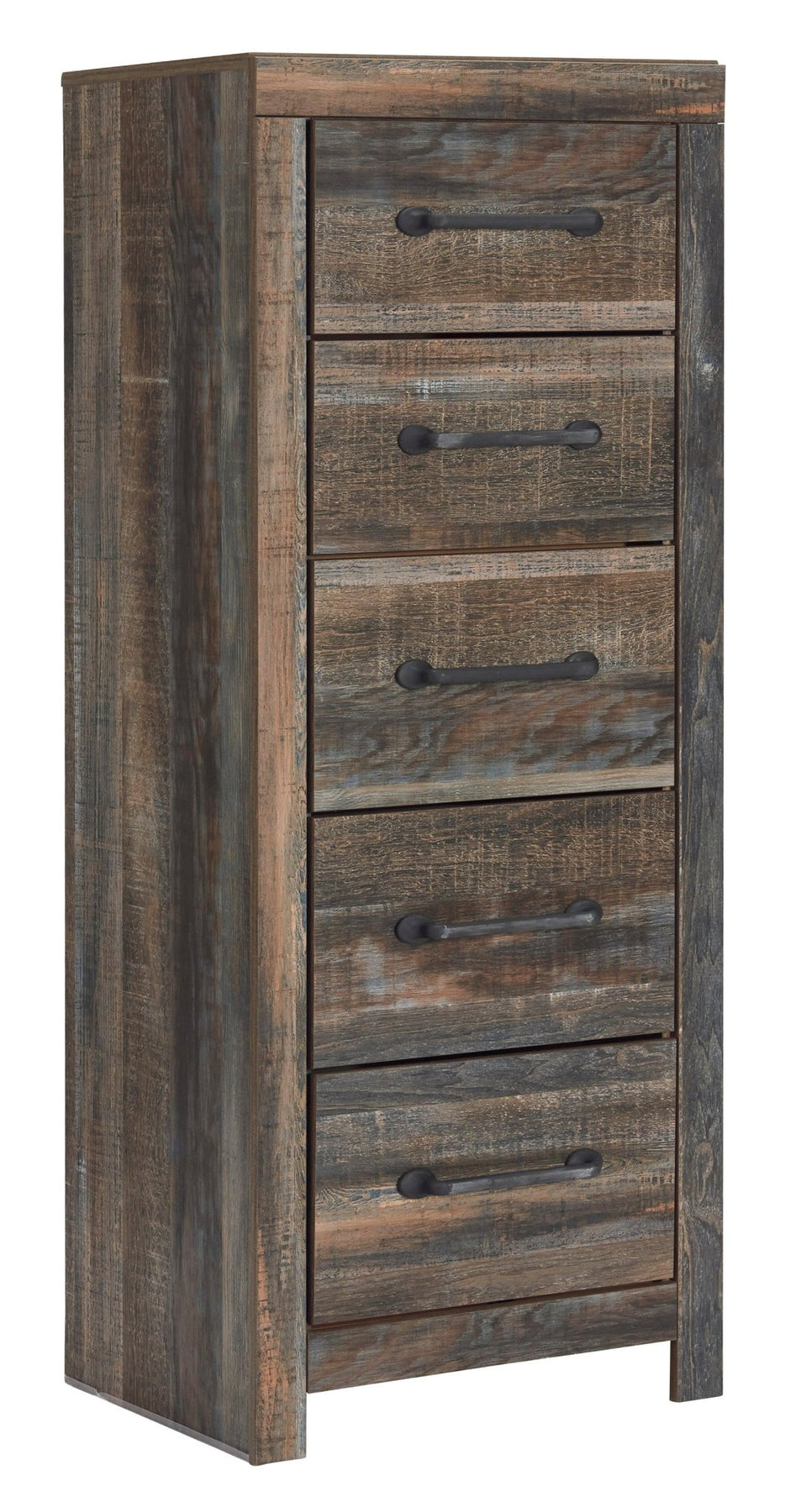Made of engineered wood (MDF/particleboard) and decorative laminate;Brown rustic finish with burnt orange and teal accents in a replicated wood grain with authentic touch;5 smooth-gliding drawers;Drawers lined with faux linen laminate;Dark-tone industrial hardware;Small Space Solution;Includes tipover restraint device;Safety is a top priority, clothing storage units are designed to meet the most current standard for stability, ASTM F 2057 (ASTM International);Drawers extend out to accommodate maximum access to drawer interior while maintaining safety