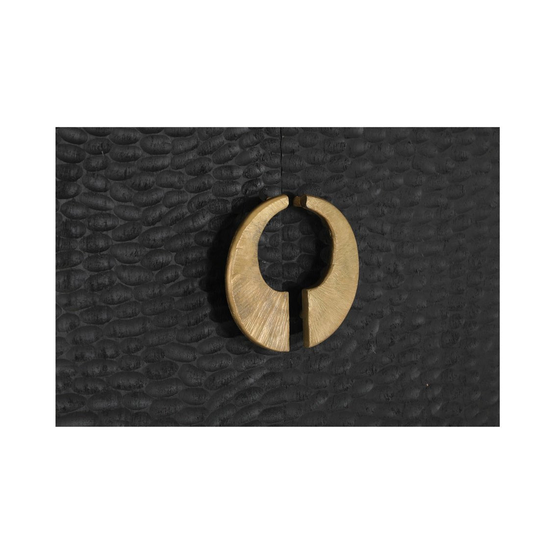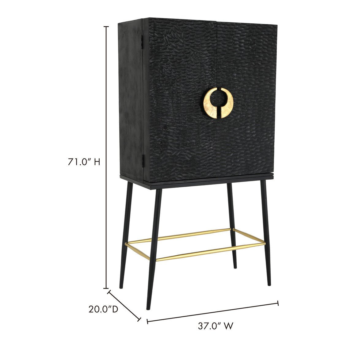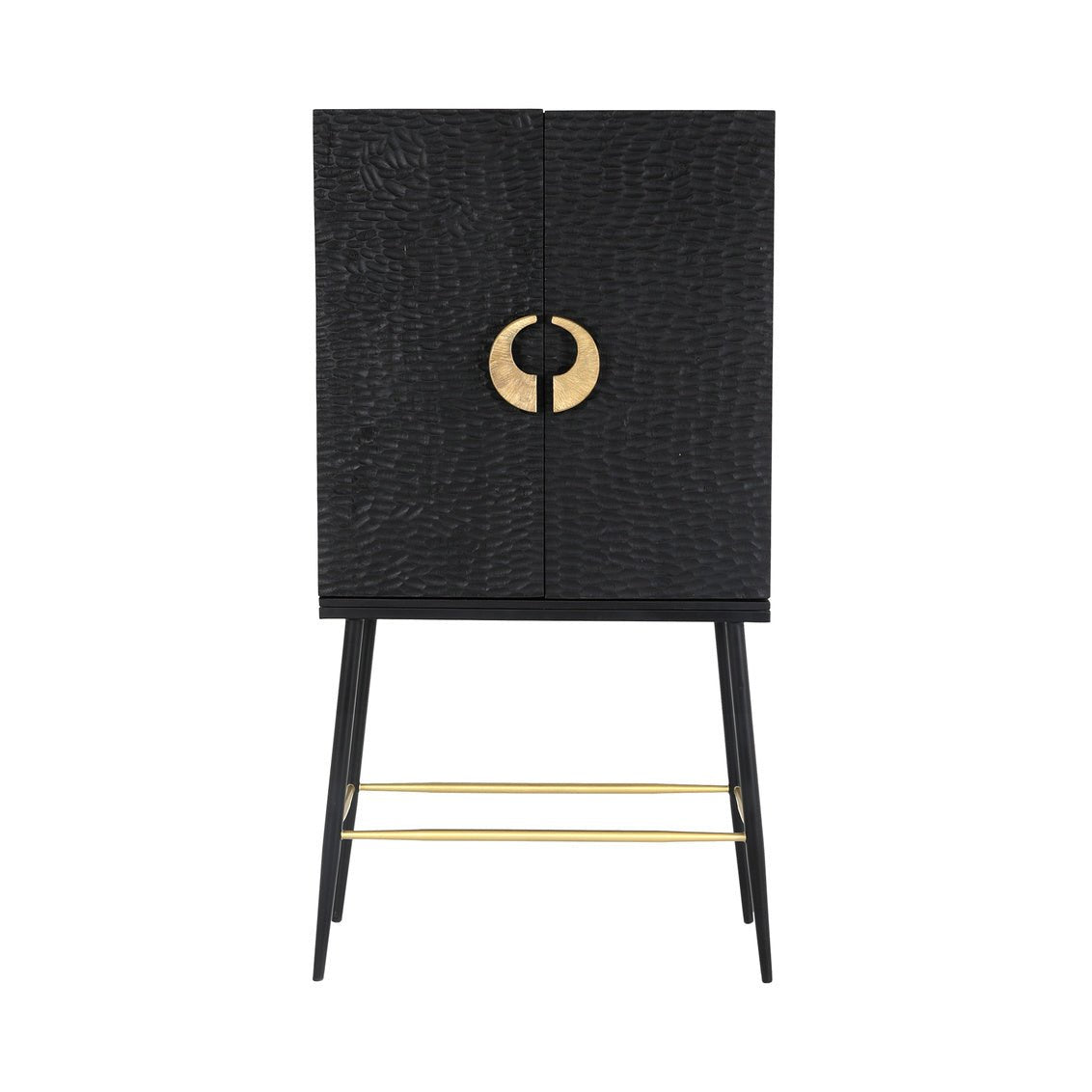Keep your favorite drinks stored in style with the Hope bar cabinet. The sleek black finish, striking indented pattern and elegant brass detailing create a unique yet contemporary aesthetic. Open the doors and you'll find ample bottle racks to store your wine and liquor.