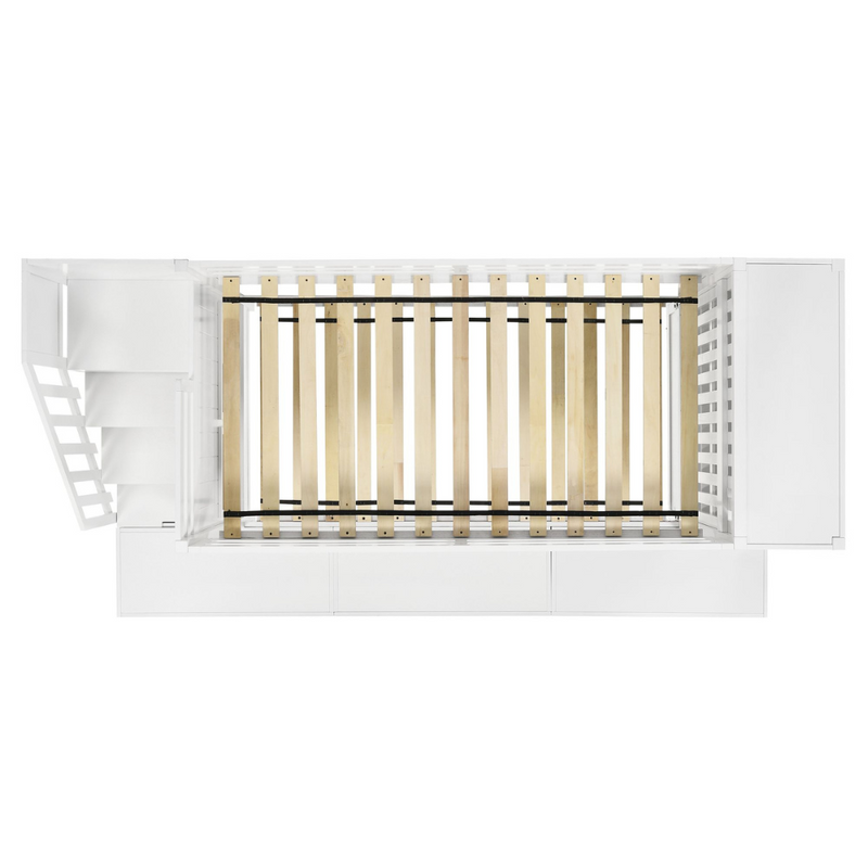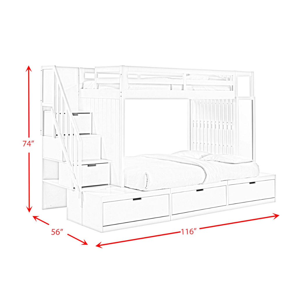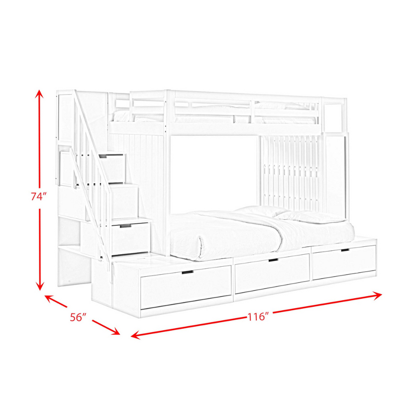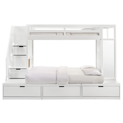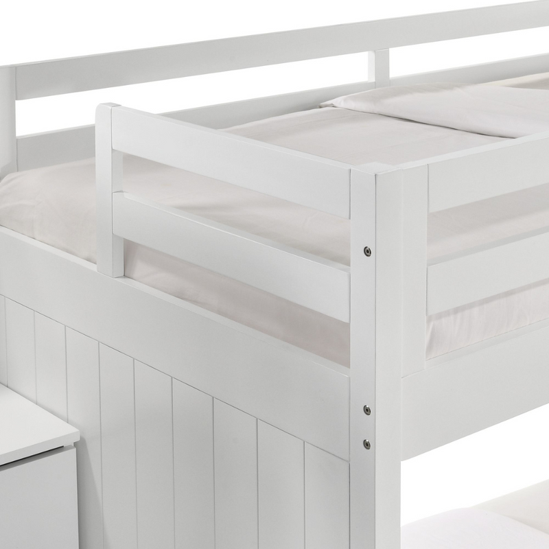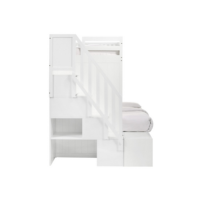 Prep yourself for all the possible storage, decor, and sleep solutions this beautiful bunk bed arrangement has to offer. Its light and airy white finish creates a larger sense of space and the calming environment you’ve been longing for. Large, spacious drawers along the base and steps allow you to make the most of these wide areas so you can keep everything at hand. Choose to turn one of the ends into a hanging rack or a 4-shelf display area for those treasured photos and significant belongings—any way you choose, this bunk bed combination will be a dream come true.