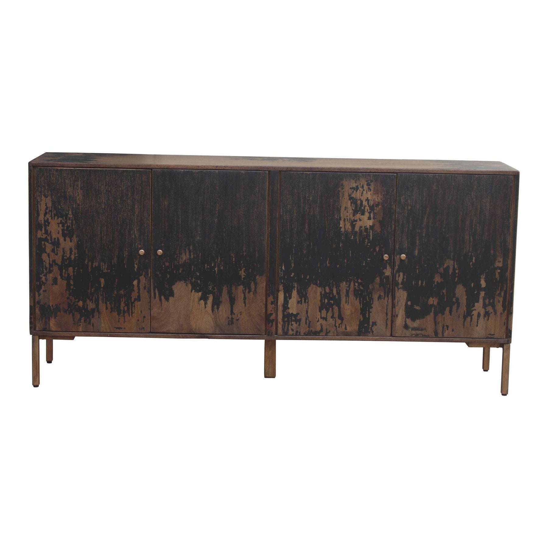 With a rustic finish, this solid hardwood sideboard will feel like it's been a part of your family for generations. The four doors open up to a fixed, center shelf, providing plenty of storage to help keep your space neat and tidy. Black antiqued finish over a golden stain.