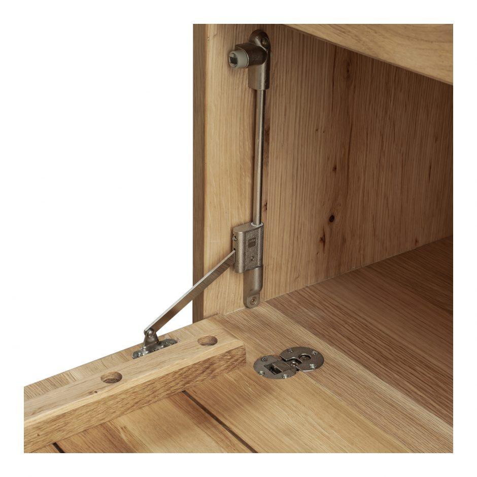 The Nevada Sideboard is the ultimate storage for your dining room. Complete with drawers and cabinets, you'll have plenty of room to store dishes, glasses, and table linen. Long-lasting oak and a metal base make this a solid piece for your home. خزانة جانبية Item Material: Solid Oak doors and drawers, Oak Veneer, Iron Base, MDF Item Color: Brown Item Height: 85.09 Item Width: 184.15 Item Depth: 40.64