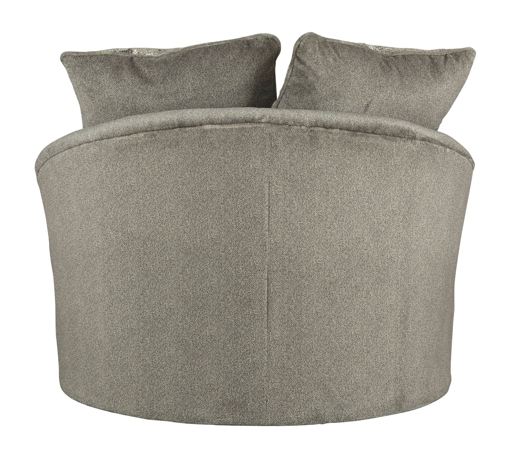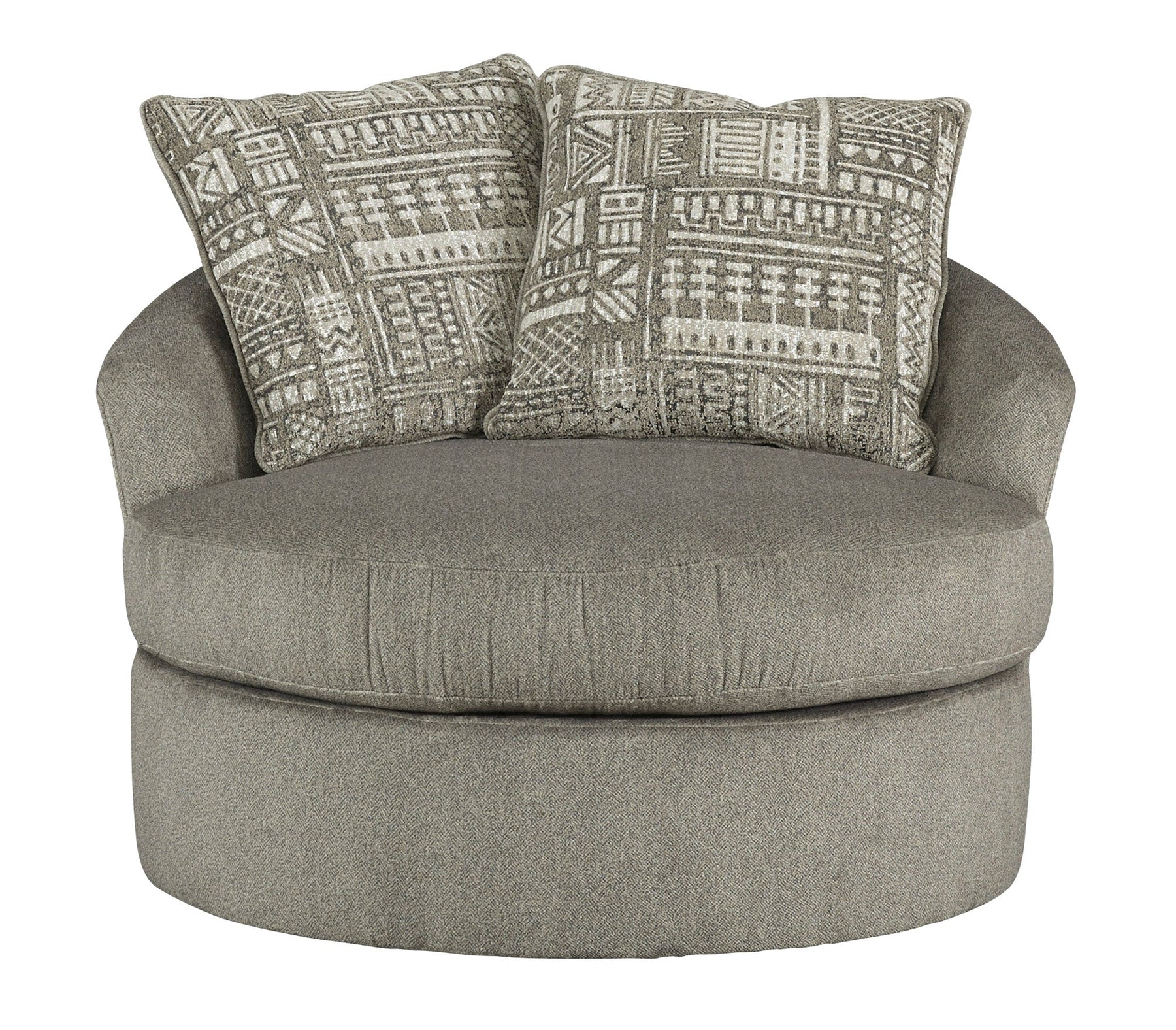 Flaunting a trendsetting silhouette, the Soletren swivel accent chair puts the contemporary in your contemporary home. Its 360-degree swivel gives you an around-the-room view to complement your comfort. Microfiber fabric satisfies your need for a piece that feels as good as it looks. Accented with soft jacquard chenille throw pillows for a splash of geometric pattern and color contrast.