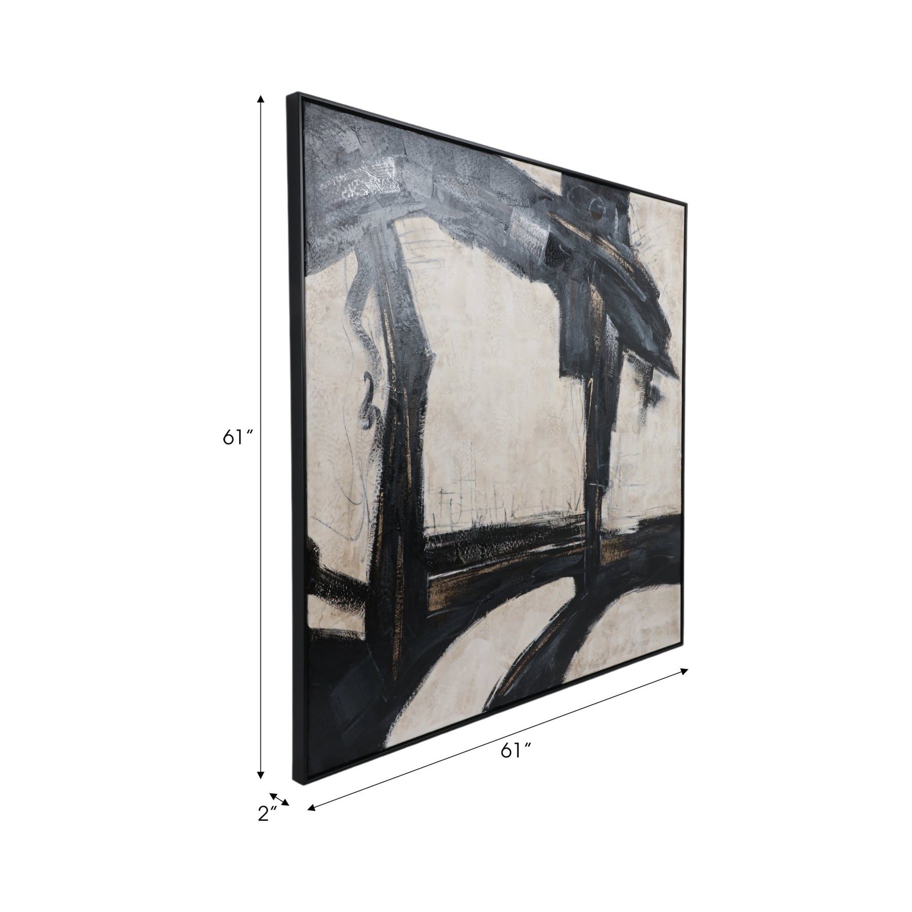 61X61 FRAMED HAND PAINTED ABSTRACT CANVAS, BLACK/G