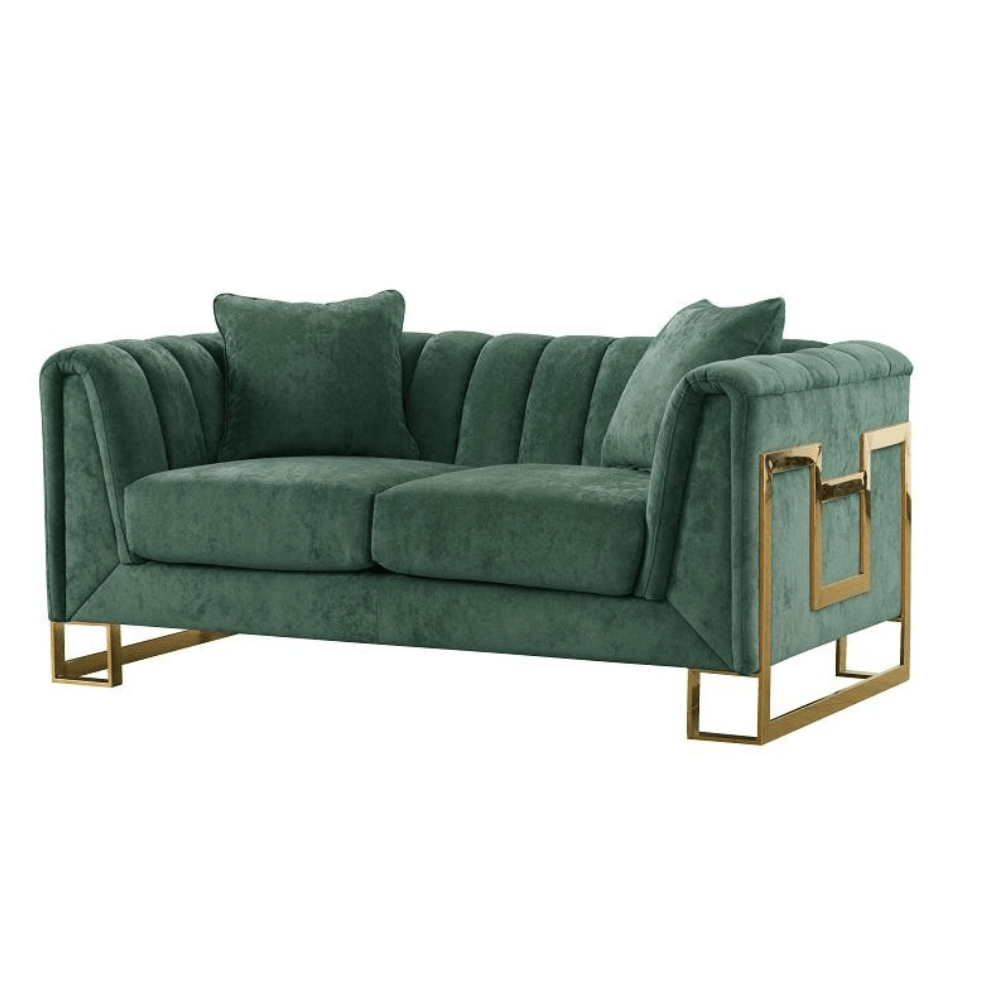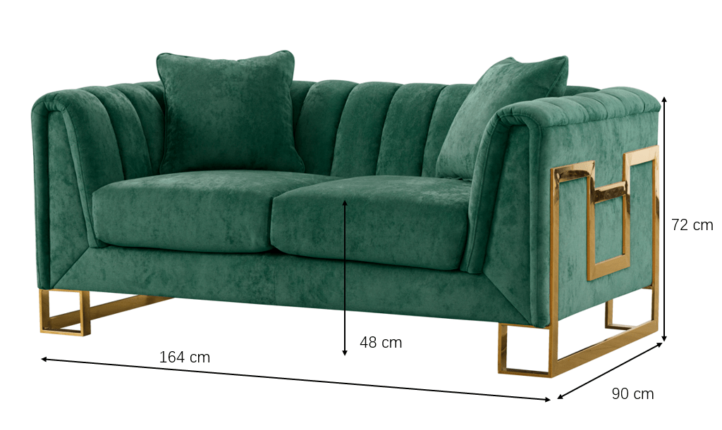An opulent Living Room 2-seater by Roots Furniture made to impress and provide comfort. This elegant Emerald Dark Green sofa with gold accents and plush cushions adds an unmistakable lavishness to any living room.