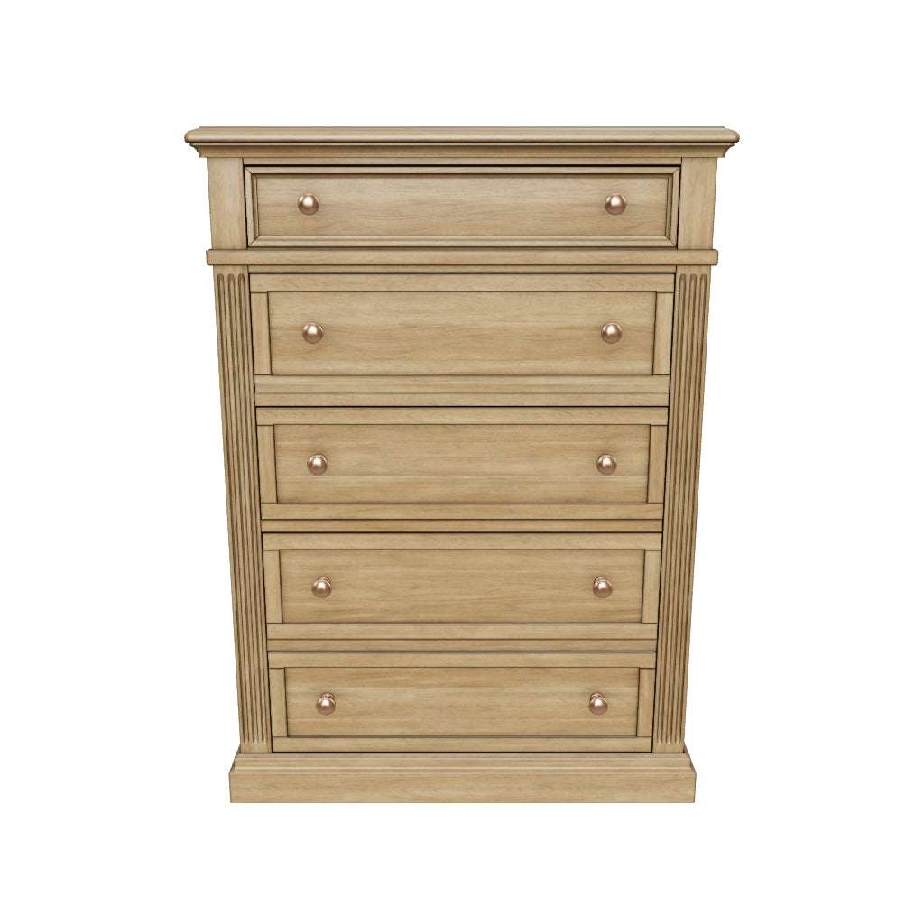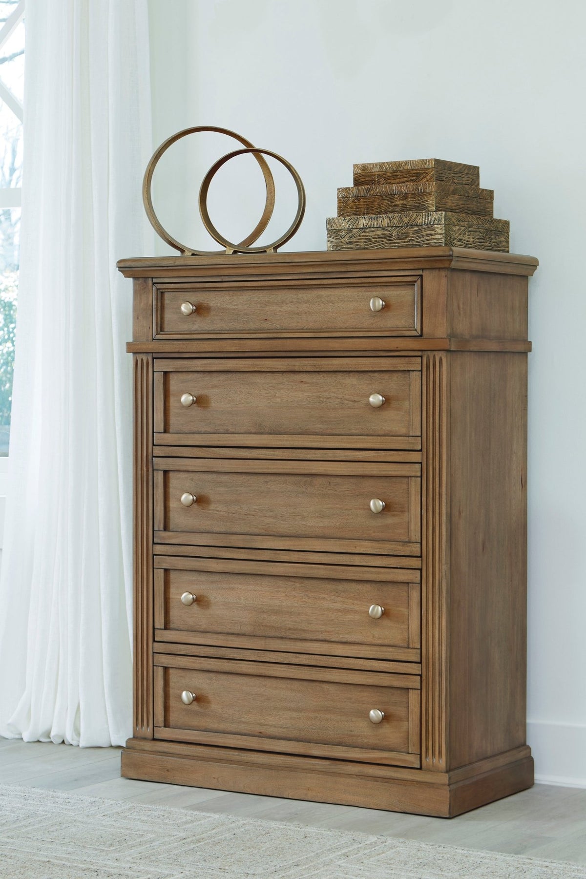 Take a traditional approach to bedroom aesthetics. The Mylarken chest of drawers ushers an upscale feel into your space, with meticulous details like a substantial top and elegant drawer moulding. A light wood tone brings warmth to the sculptural silhouette. Grand in both beauty and function, this timeless chest is a masterclass in refinement.