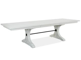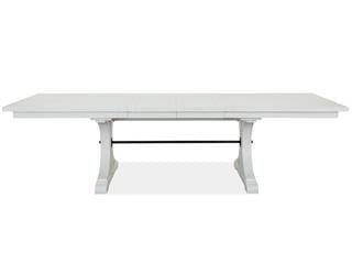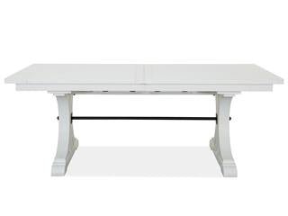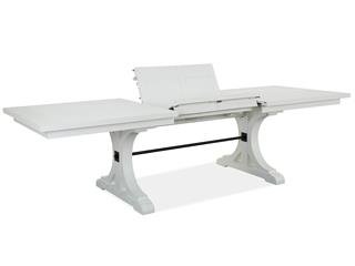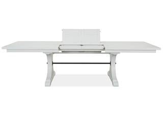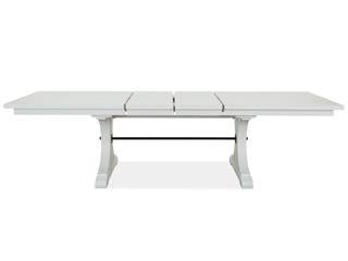 The Harper Springs Wood Trestle Dining Table features a rustic Silo White finish, forged iron accents, and a spacious design perfect for gatherings. With two 16-inch butterfly leaves, it extends to seat up to 10 guests—ideal for farmhouse and industrial-style dining rooms.