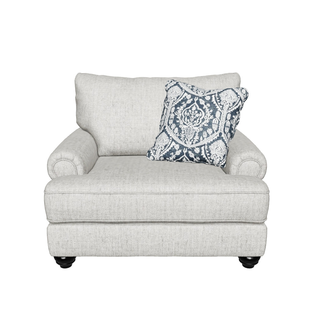 A triumph in transitional design, the Morren oversized chair invites you to indulge in eye-catching texture and cozy comfort. Flared roll arms and loose, reversible cushions give this classically styled chair a sense of everyday ease. Soothing blue-hue accent pillow adds a wonderful layer of interest.