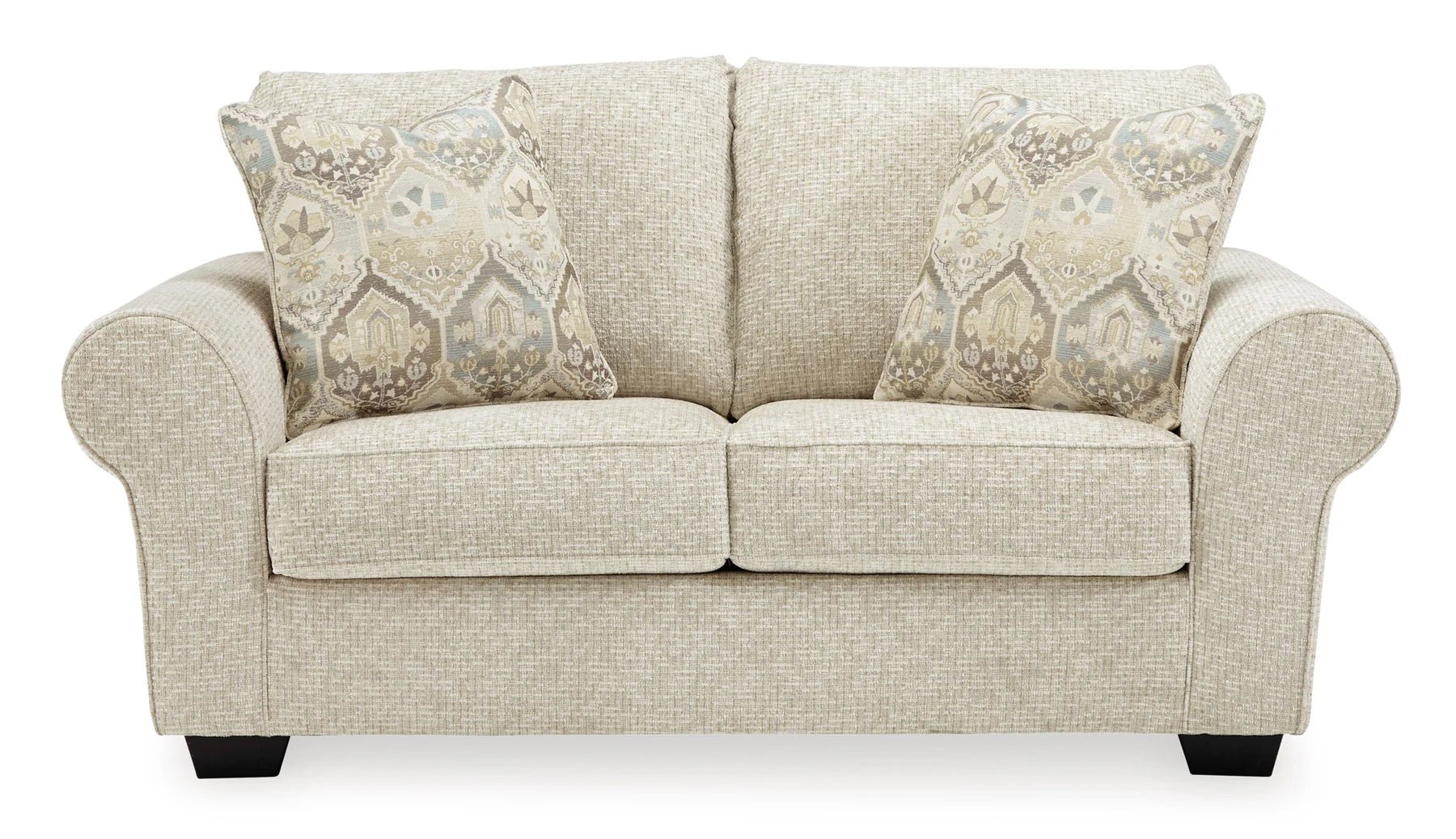 Blending classic elements like sumptuous flared roll arms with tailored box cushions and tapered black feet for up-to-date appeal, the Haisley loveseat exudes that transitional aesthetic that looks and feels right at home. Offering plenty of room for everyone to make themselves comfortable, this large-scale loveseat is wrapped in a soft, chunky weave fabric loaded in texture. Light and lovely ivory upholstery makes for such an easy-breezy blend.