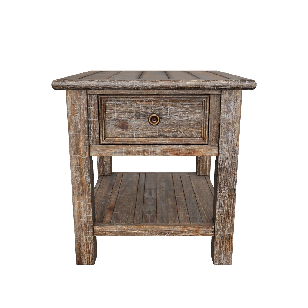 Inspired by heavy and hearty lodge-style furnishings from days gone by, the Wyndahl end table brings the past brilliantly into the present. Distinctive details include a stocky, linear profile, plank-effect display shelf and a distressed aged pine color finish with light wire-brushed texture that’s pure artistry.