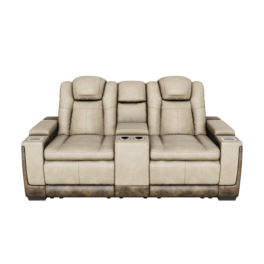 One-touch power control with adjustable positions, Easy View™ adjustable headrest, extended ottoman and zero-draw USB plug-in;Corner-blocked frame with metal reinforced seat;Attached cushions;High-resiliency foam cushions wrapped in thick poly fiber;Faux leather upholstery;Easy View™ adjustable headrest puts your head and neck in optimum position for reading or watching TV even if you're fully reclined;Zero draw technology only consumes power when the USB receptacle is in use;Zero-gravity mechanism allows optimum reclining comfort with infinite reclining positions at the touch of a button;Center console with storage compartment and 2 cup holders;Wireless and USB charging,Power Reclining Loveseat with Console