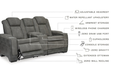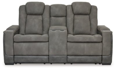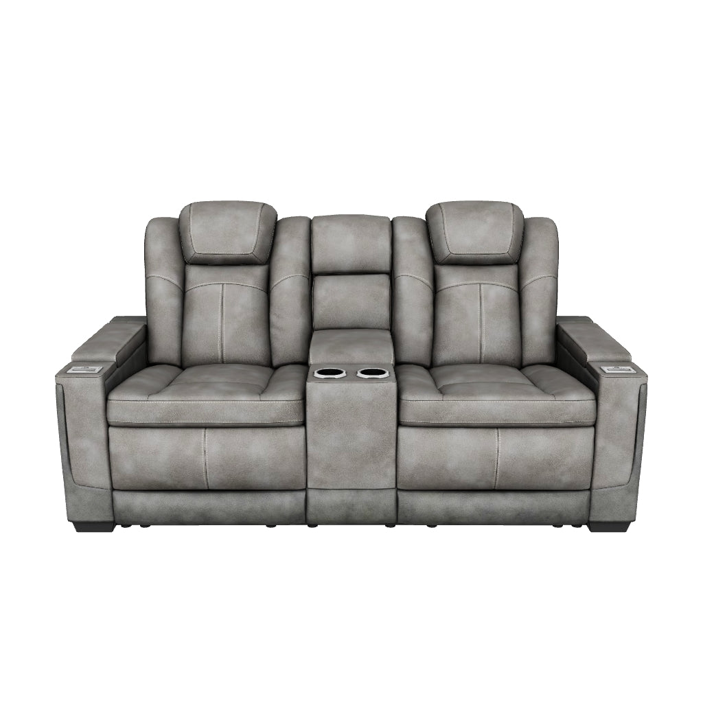 Dual-sided Recliners;One-touch power control with adjustable positions, Easy View™ adjustable headrest, extended ottoman and zero-draw USB plug-in;Corner-blocked frame with metal reinforced seat;Attached cushions;High-resiliency foam cushions wrapped in thick poly fiber;Faux leather upholstery;Easy View™ adjustable headrest puts your head and neck in optimum position for reading or watching TV even if you're fully reclined;Zero draw technology only consumes power when the USB receptacle is in use;Zero-gravity mechanism allows optimum reclining comfort with infinite reclining positions at the touch of a button;Center console with storage compartment and 2 cup holders;Storage armrests with wireless and USB charging,Power Reclining Loveseat with Console