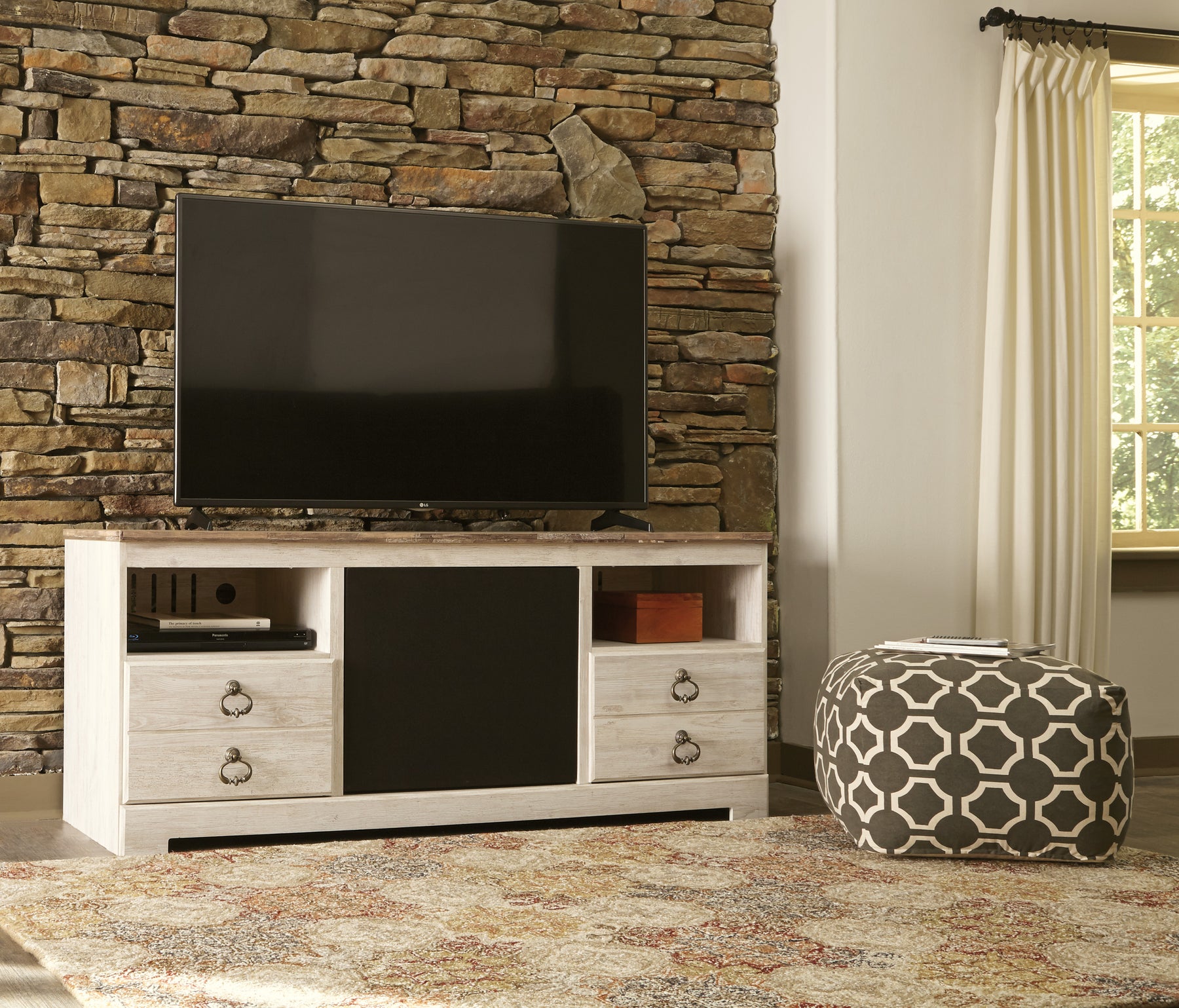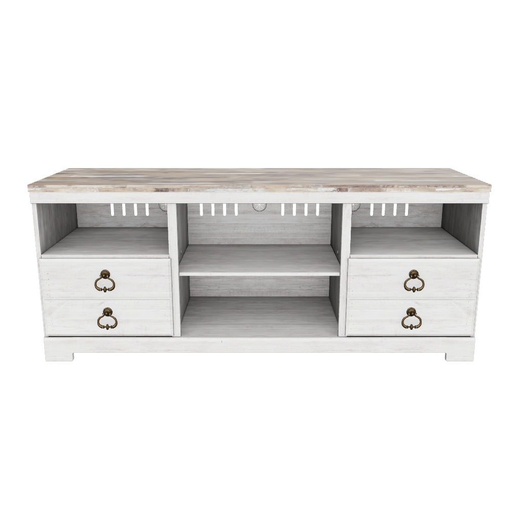 The Willowton TV stand with fireplace option is the ultimate statement piece for a coastal cottage or shabby chic inspired retreat. Its whitewash finish is wonderfully easy on the eyes. Paired with the TV stand’s unique plank-style top, it’s a driftwoody look that has our minds drifting away to beachy-keen escapes. Enhance the sense of homey warmth by removing the center shelf and making room for the electric fireplace insert, sold separately.