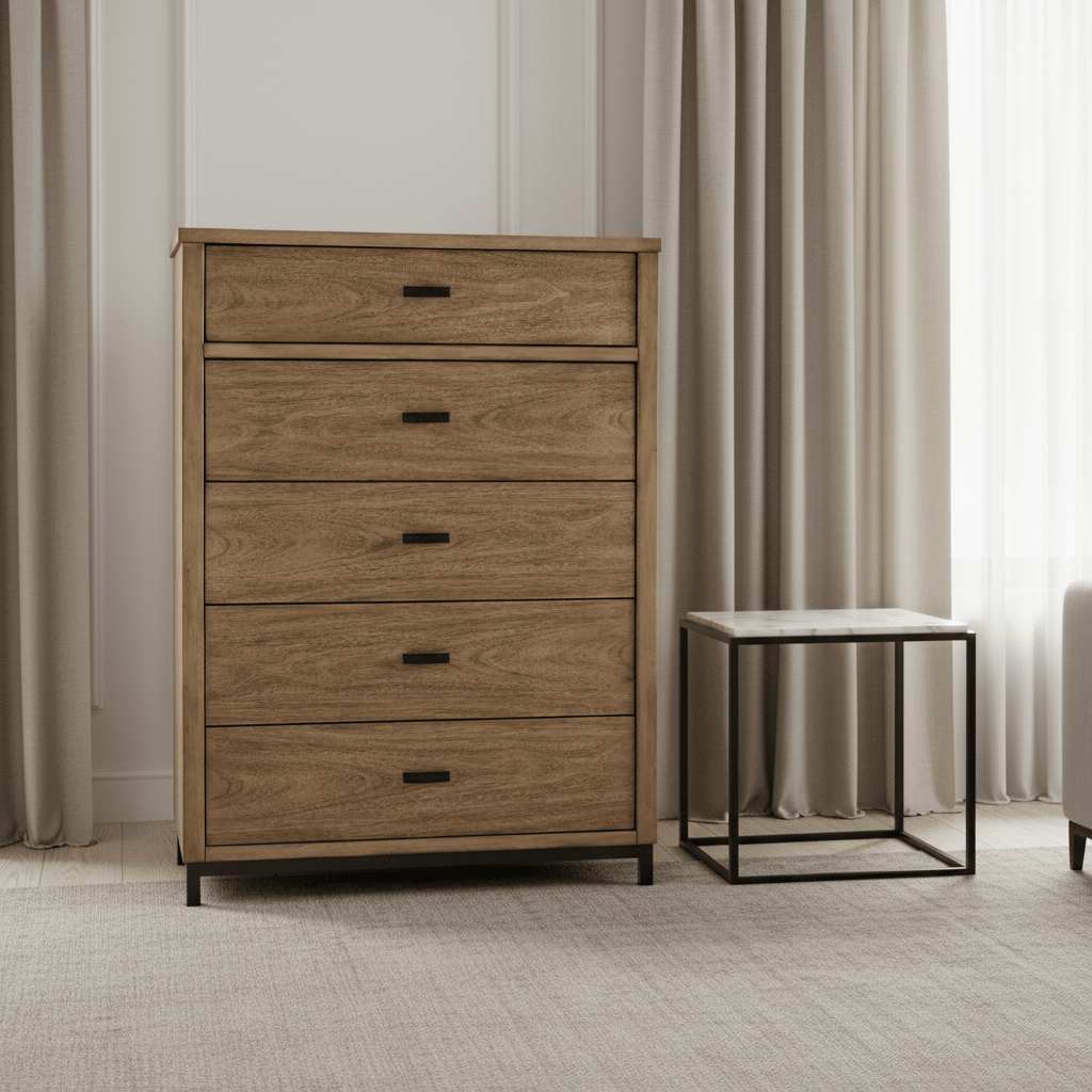 Wood Products and Other;Metal, Five Drawer Chest, Light, Made with hardwood solids, mango wood veneer, MDF substrates and metal;Light brown wood-tone finish;Gunmetal gray finish on metal legs;Metal bar pulls;5 drawers with fully finished interior, dovetail construction and heavy duty ball-bearing side glides (top drawer felt lined)