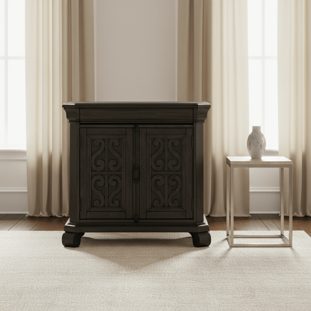 Warm and inviting like an old French friend, Bellamy welcomes with European inspired styling in a unique Peppercorn finish and matte black pewter accented hardware. Scrolling open woodwork adorns the well appointed media chest doors while roomy dressers and chests feature rounded corners atop rounded bun feet. A plethora of bed options offer upholstered tufted headboards, storage footboards, panel headboards and gorgeous shaped panels with or without sumptuous scrolled design work for a Chateau feel for any taste.