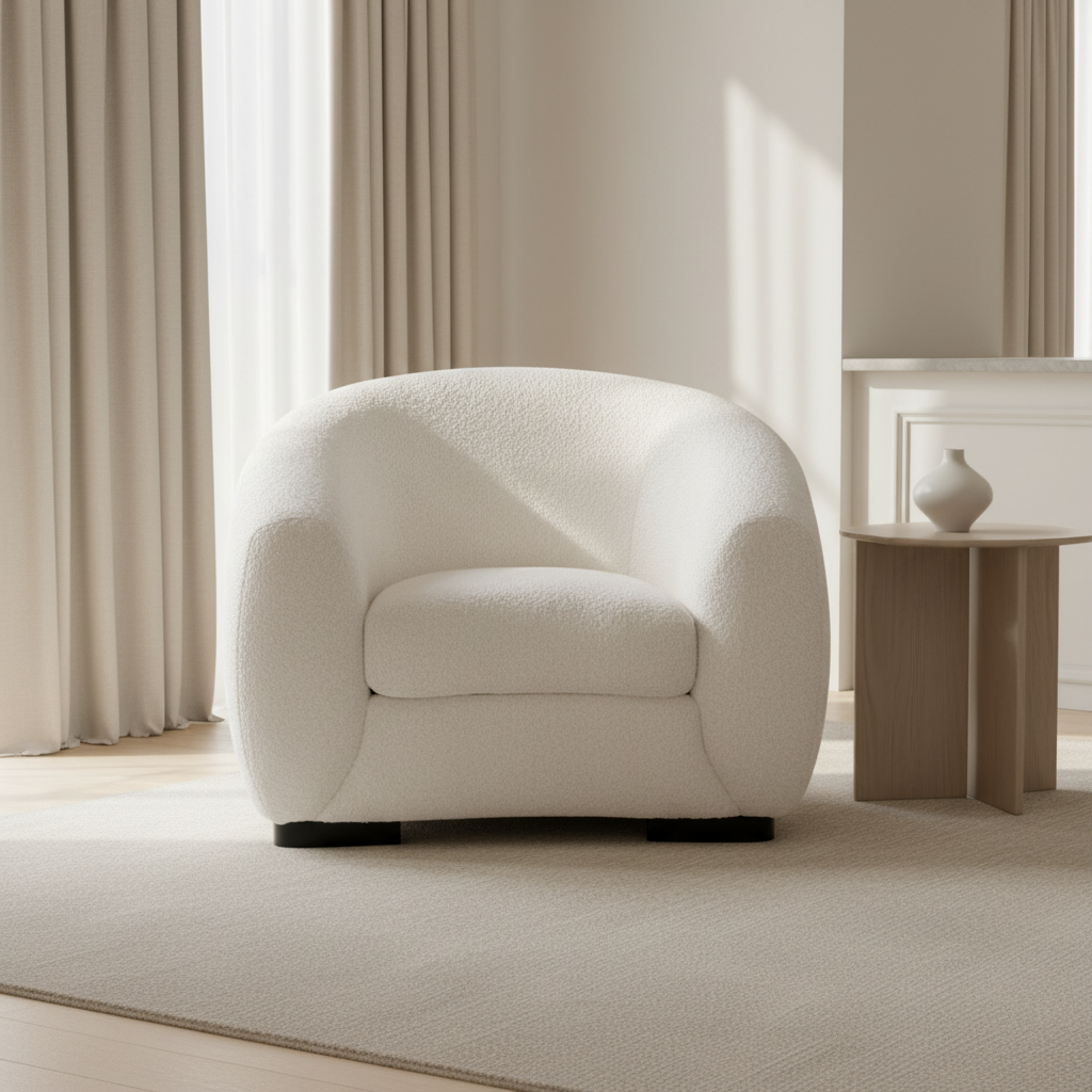 Curvaceous design is wrapped in a creamy Beige boucle that brings soft texture and dimension to the piece