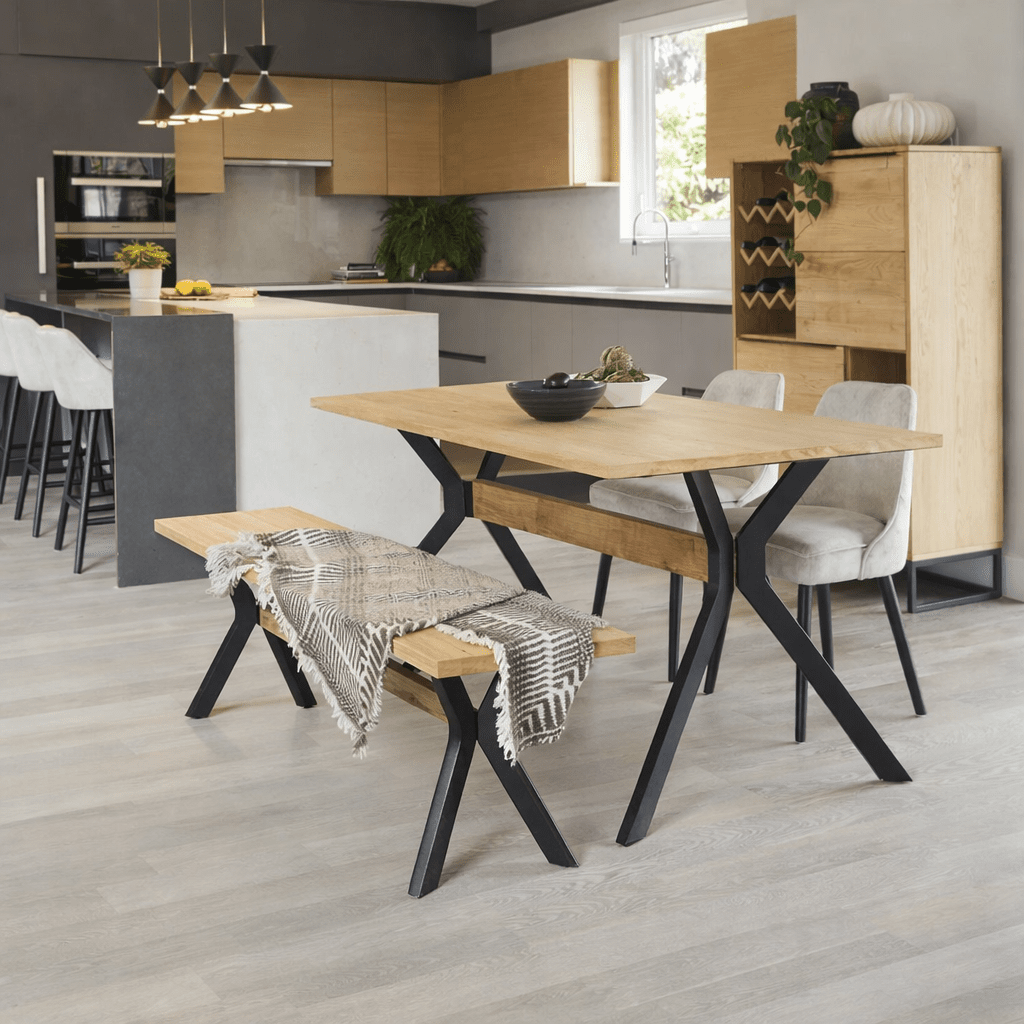 The Nevada Bench is the ultimate seating for your family. Complete with an expansive oak face and strong steel legs, this piece of furniture will last through countless meals and occasions. Its warm wood and dark metal combo is perfect for the modern rustic home. مقعد طويل Item Material: Solid Oak, Metal Base Item Color: Brown Item Height: 46.99 Item Width: 160.02 Item Depth: 38.1