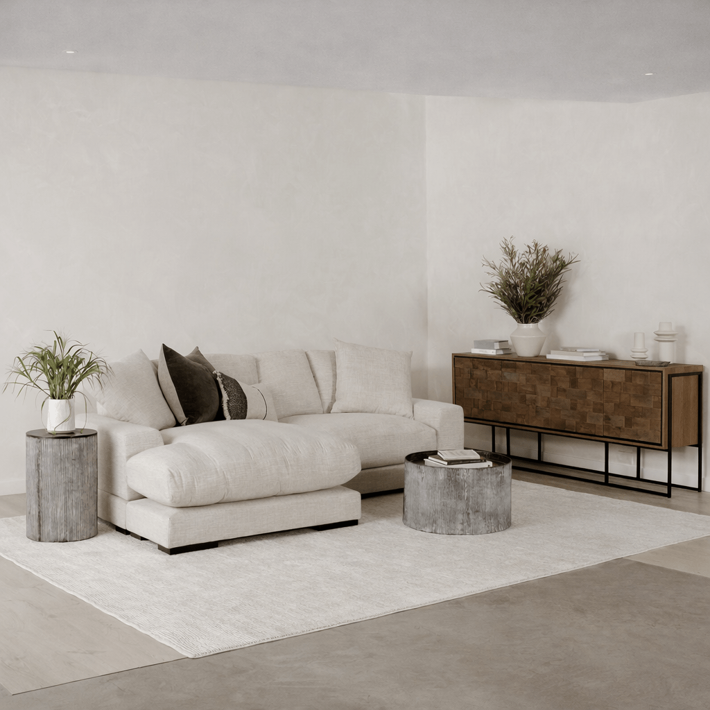 A fusion of comfort and elegance with clean lines and plush cushions, the Plunge sectional is masterfully crafted to maximize space and provide unparalleled relaxation. Its versatile flip chaise feature allows a left or right-side orientation that effortlessly adapts to create a sanctuary of style and repose, while its improved channeling and filling distribution ensures soft landings and comfort for years to come.