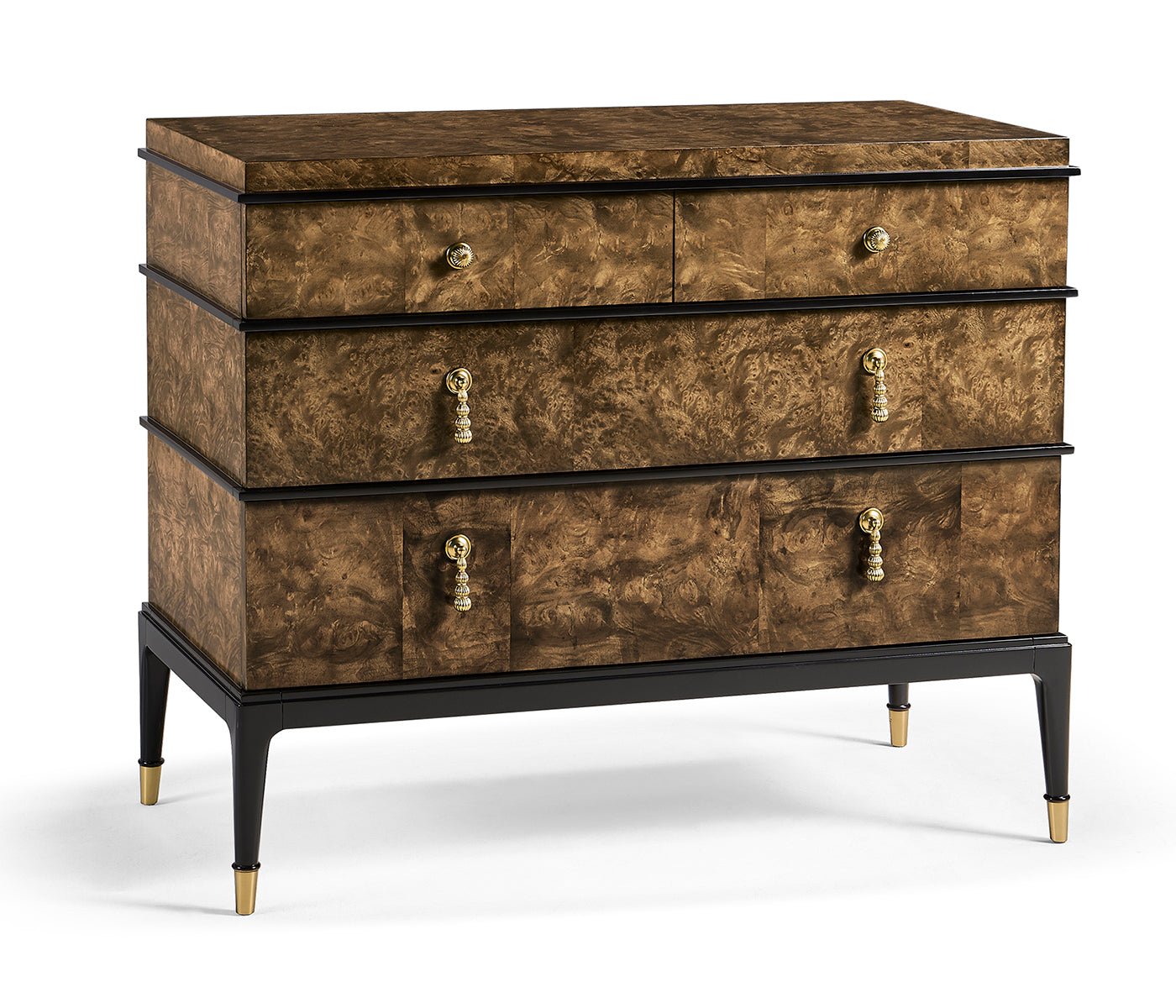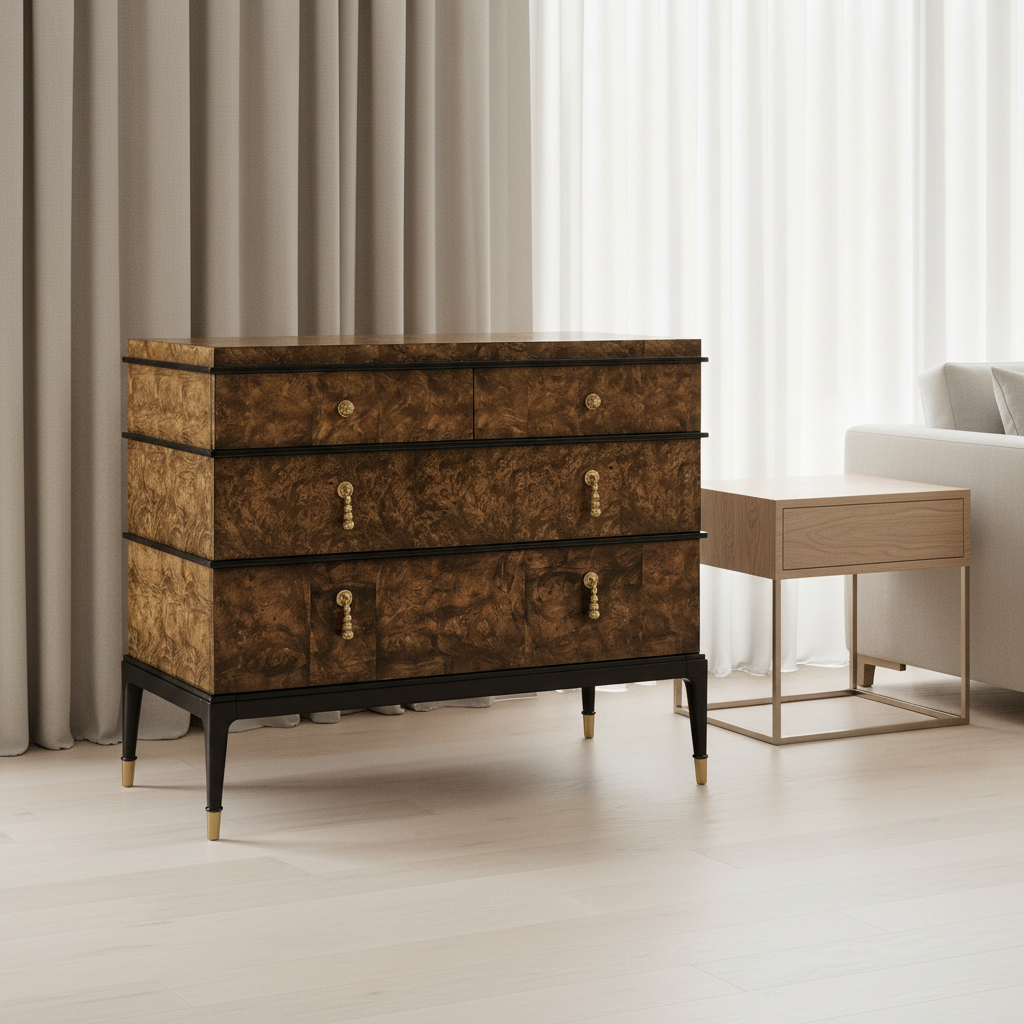 Step into the world of modern design with the Jacques chest. Its clean lines, bold contrasts, and minimalist elements define its contemporary charm, making it a statement piece that seamlessly blends with contemporary interiors. The piano black lacquer accents provide a striking contrast against the dyed brown burl veneer, creating a visual harmony that captivates the eye. This juxtaposition of materials adds depth and drama, making the chest a true work of art. Brass accents not only enhance the aesthetics but also elevate the chest, giving it an air of elegance that complements its contemporary design.