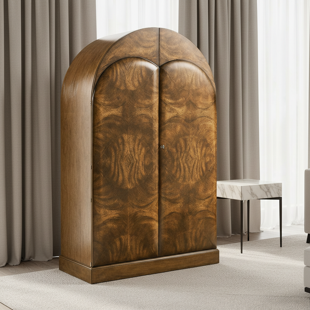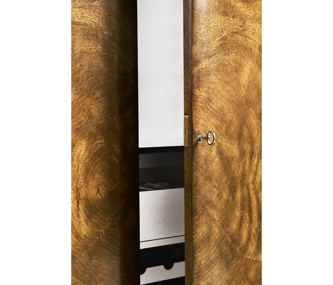 The Jacques bar armoire is a fusion of classic and contemporary elements that create a remarkable piece of functional art. Crafted from crotch cerejeira and flat-cut mahogany veneers, this bar cabinet boasts a stunning array of textures and patterns. The natural cerejeira finish enhances the wood's inherent beauty, giving the cabinet an organic and timeless appeal. Behind its arched doors that feature custom brass hinges, you’ll find an array of storage solutions for your entertainment accompaniments showcased in antiqued mirror, stainless steel, and eggshell detailing. The lighted interior and stone worktop ensure a suitable workspace for crafting delicious concoctions. Become a master of hosting with the Jacques bar armoire.