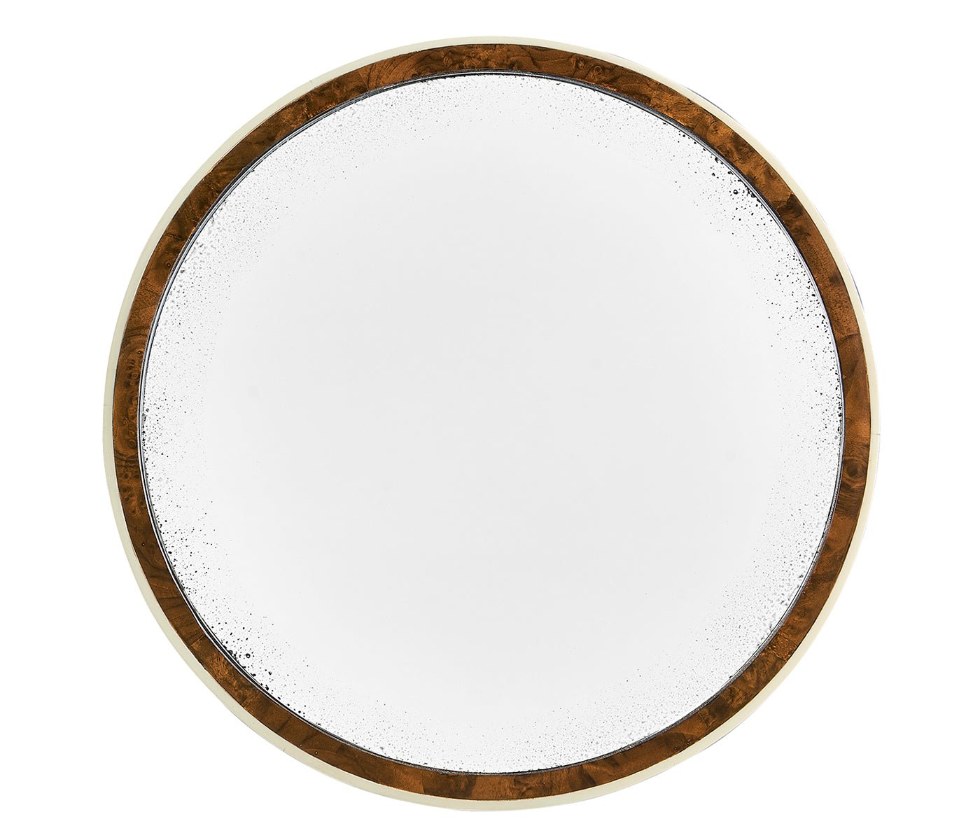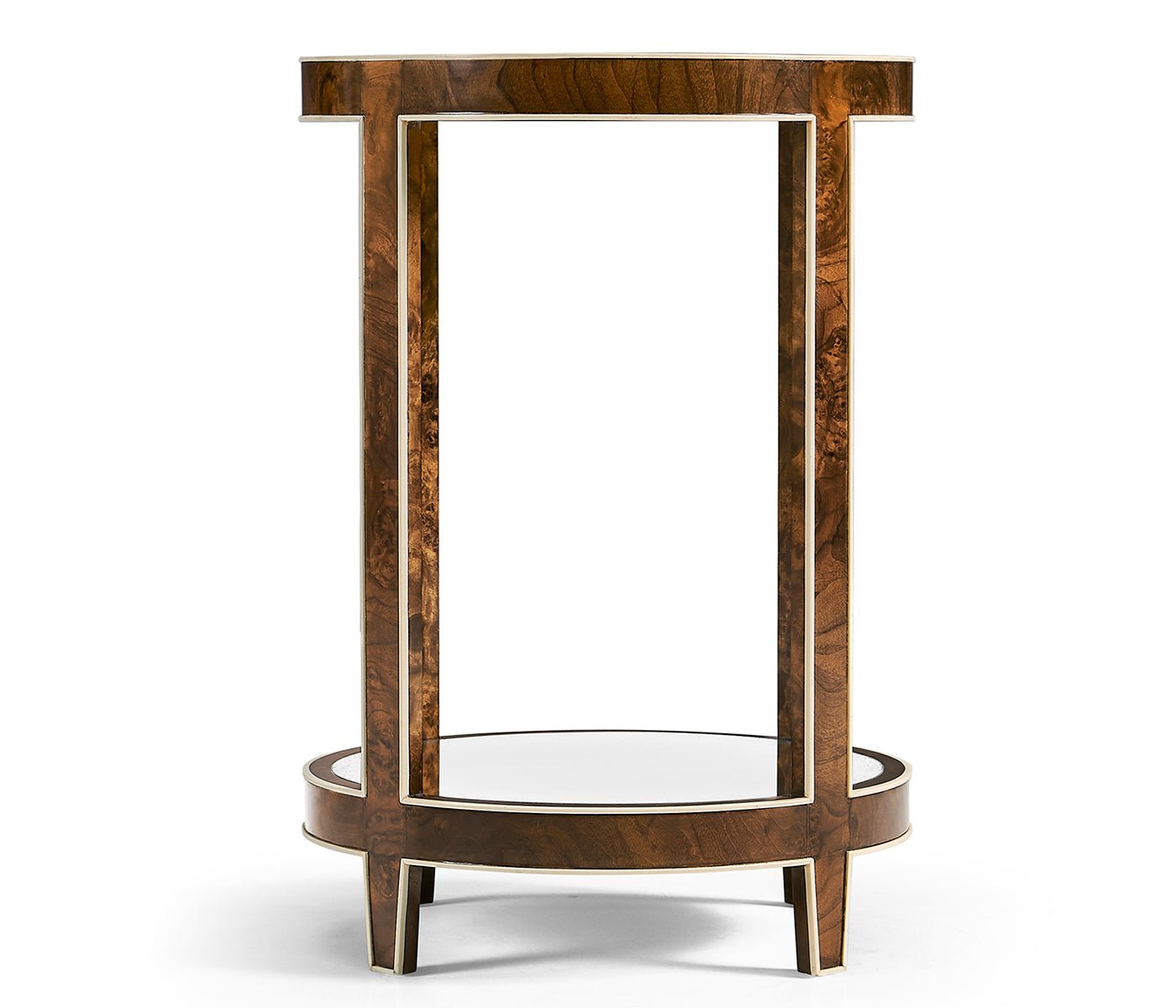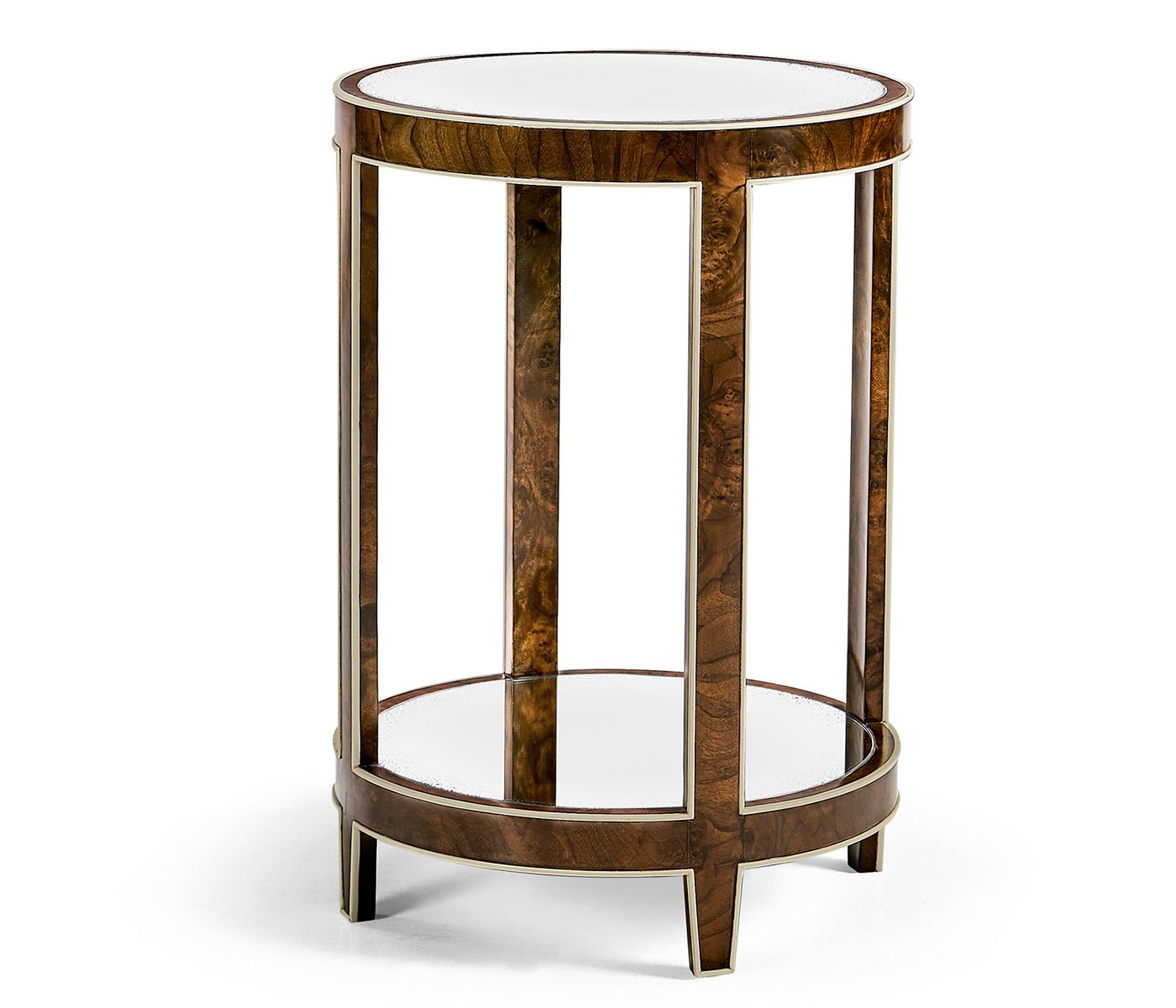 Enrich your surroundings with the Jacques end table. Crafted from mahogany veneers, this side table boasts a rich and captivating appearance that exudes warmth and natural beauty. The medium brown mahogany finish highlights the wood's grain, creating a piece that resonates with classic sophistication. The antique mirrored top and shelf infuse a sense of vintage glamour and feature faux bone inlay, adding a touch of elegance and contrast to the table. The line is repeated down the delicate legs to the tapered feet, adding beautiful contrast to this classic silhouette.