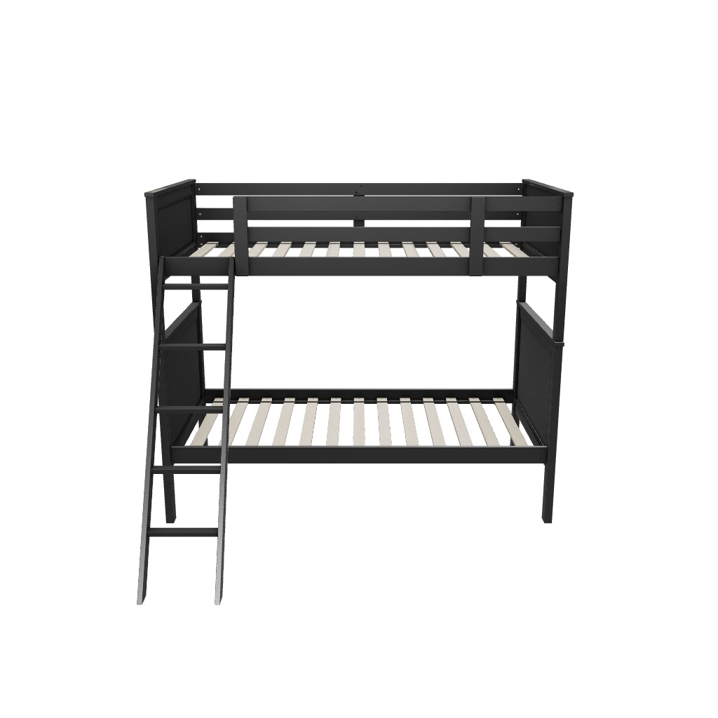, Twin over Twin Bunk Bed, , Includes upper and lower bunk bed panels, rails, roll slats and ladder;Made with solid hardwood frames and MDF substrate;Black finish;Top bunk with protective side rails;Sturdy ladder leads to top bunk;The Consumer Product Safety Commission states top bunks not be used for children under 6 years of age;Included roll slats eliminate need for foundation/box spring;Mattresses available, sold separately;Assembly required;Bed is not compatible with an adjustable base