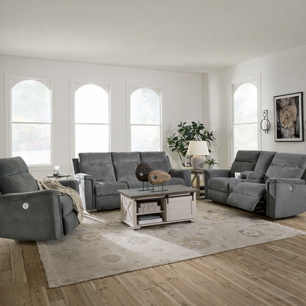 Fabric, Reclining Power Sofa, Light, Dual-sided recliner; middle seat remains stationary;One-touch power control with adjustable positions and zero-draw USB port;Zero-draw technology only consumes power when the USB receptacle is in use;Corner-blocked frame with metal reinforced seat;Attached cushions;High-resiliency foam cushions wrapped in thick poly fiber;Polyester micro chenille upholstery;Power cord included; UL Listed