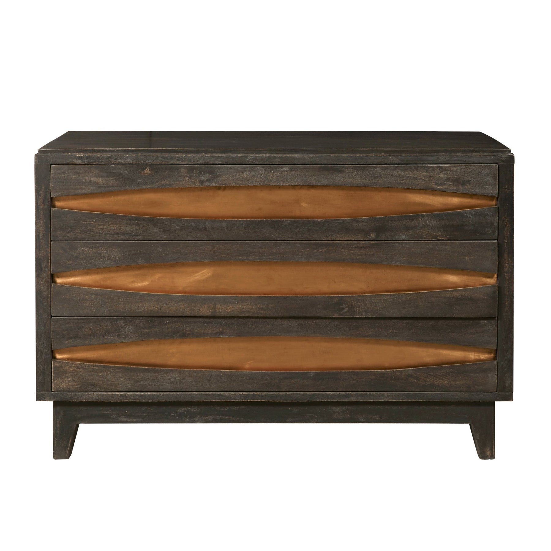 55.000" L x 21.000" W x 39.000" H Color: Brown Material: Solid acacia, finished aluminum inserts in drawer fronts Features: Modern inspired chest accentuated with copper inlays.,Three drawers provide an amplitude of storage perfect for a living area or game room.,The rustic finish is complemented with copper inlays,,Constructed with Solid Acacia and finished aluminim inserts in the drawer fronts,Minimal assembly required.