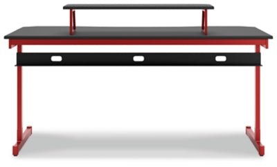 Made with engineered wood and durable decorative laminate;Metal frame with red powder coated finish;Raised monitor stand;Headset hanger mounted on side;Raceway underneath top for cord management;Assembly required