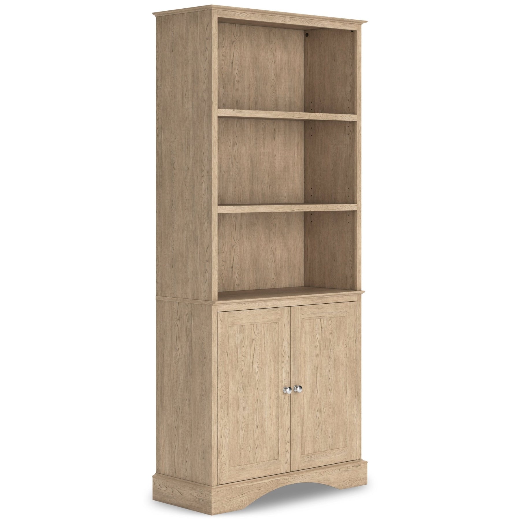Open the door to versatile, relaxed style with the Elmferd bookcase. Its natural light oak wood pattern has a classic, inviting appeal. With three open shelves and a lower cabinet with an adjustable shelf, this bookcase étagère provides the perfect balance of form and function.