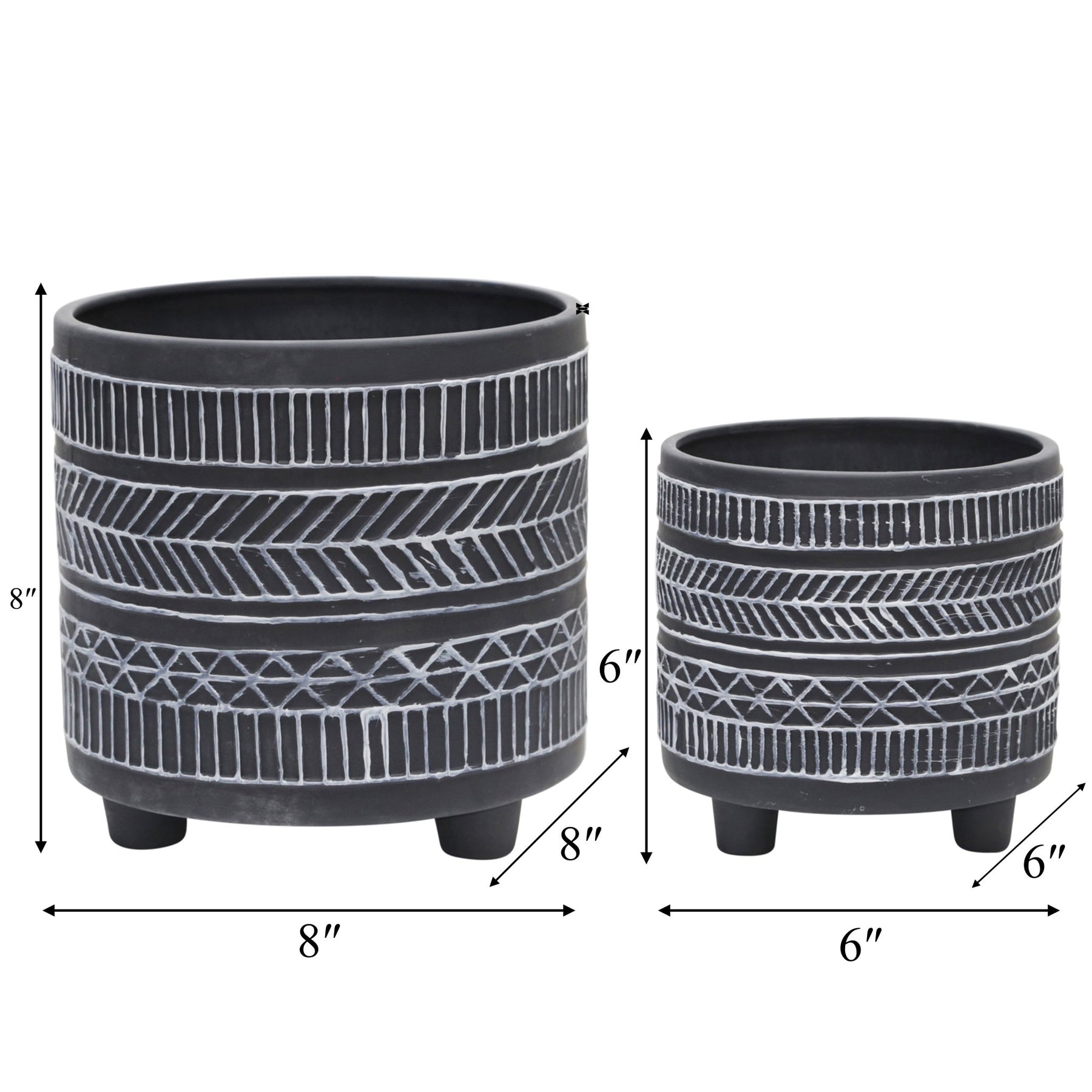 S/2 TRIBAL LOOK FOOTED PLANTER 6/8", BLACK
