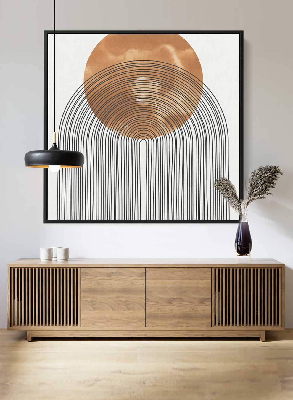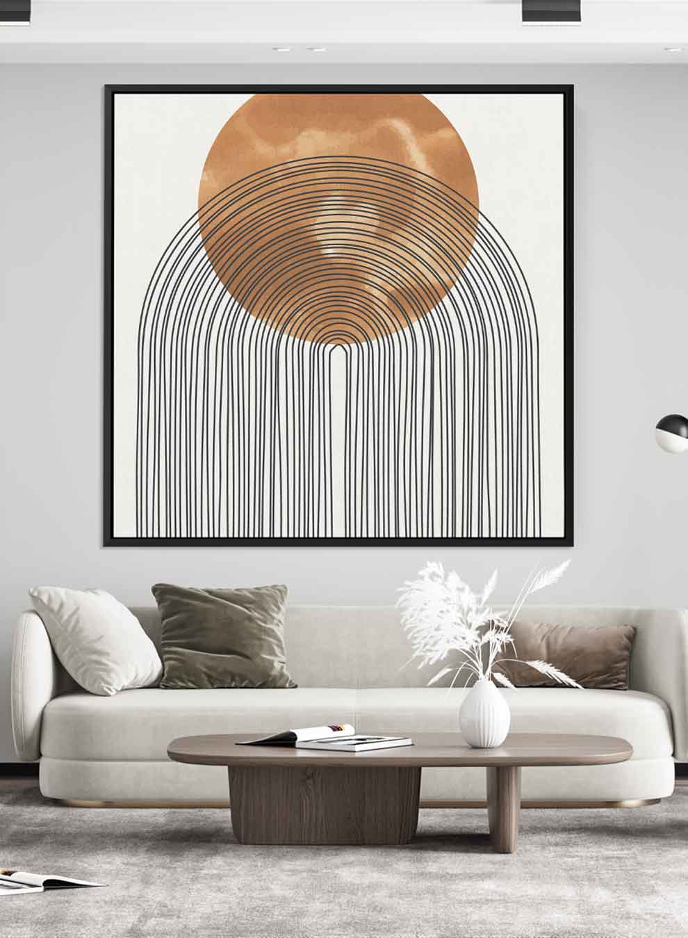 Square Canvas Wall Art Stretched Over Wooden Frame with Black Floating Frame and Sun With Curves Abstract Painting