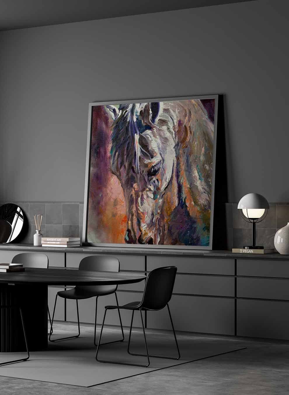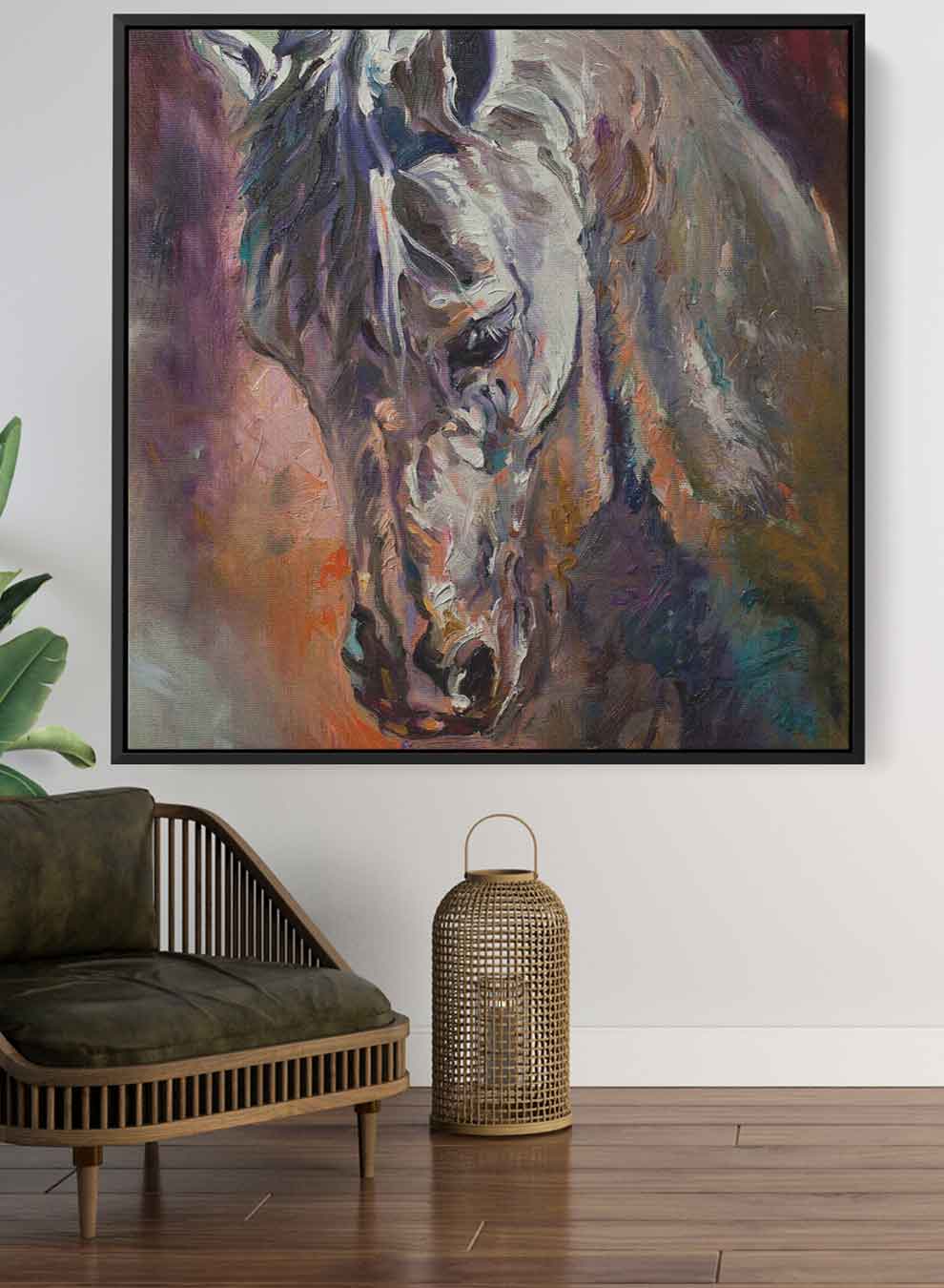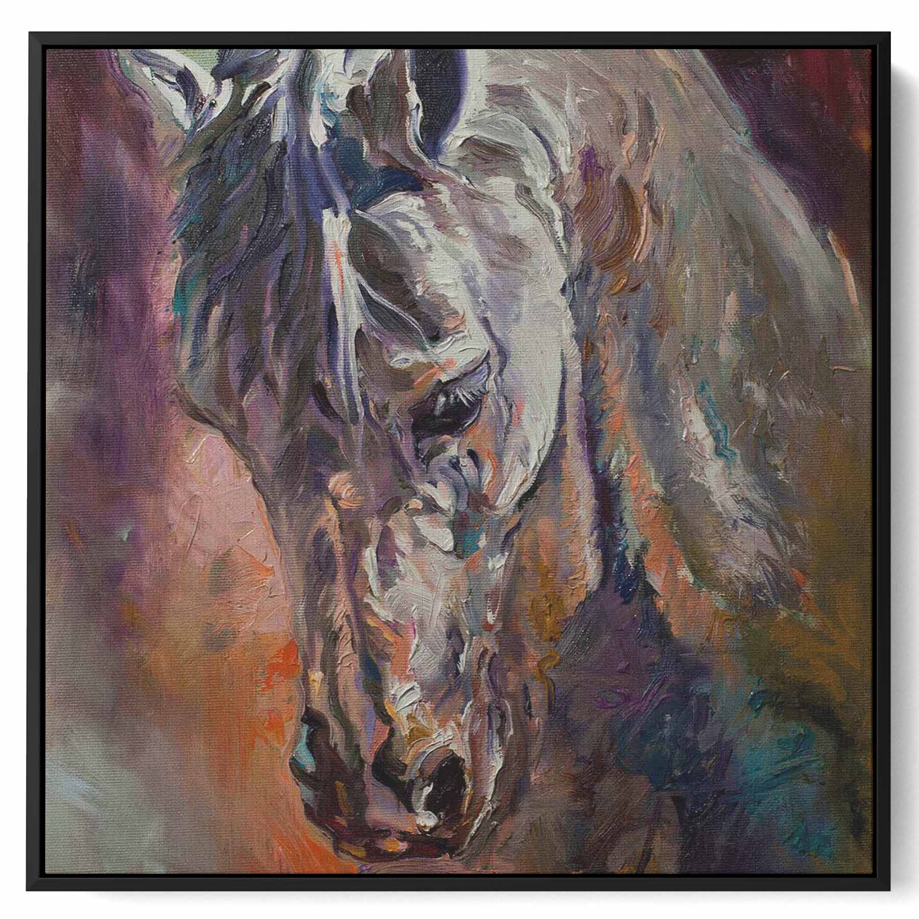 Square Canvas Wall Art Stretched Over Wooden Frame with Brown Floating Frame and Horse Head With Shiny Eyes Painting