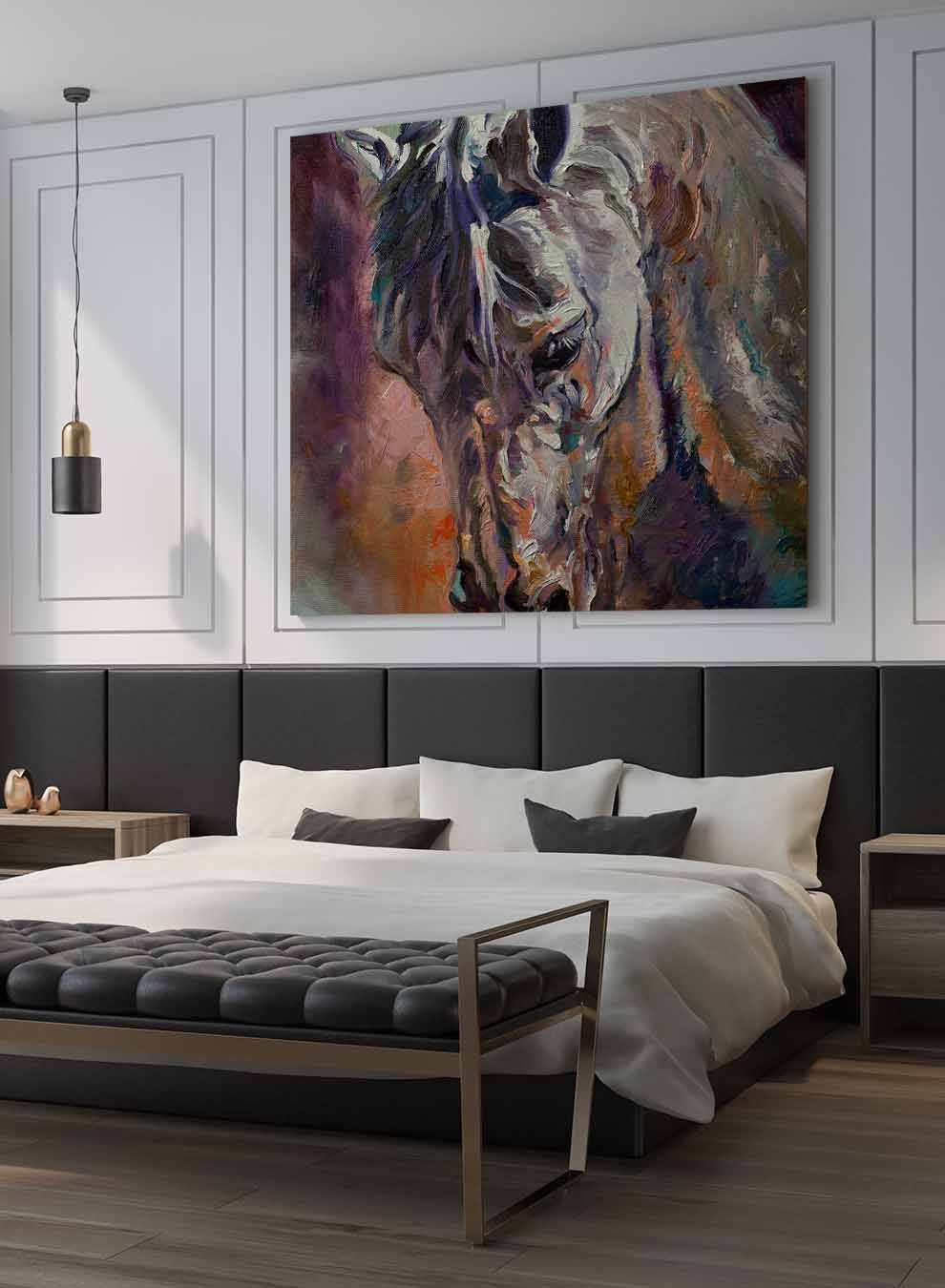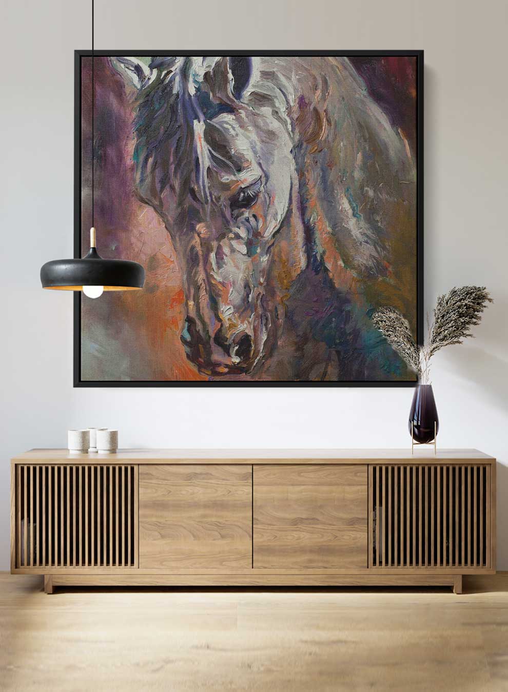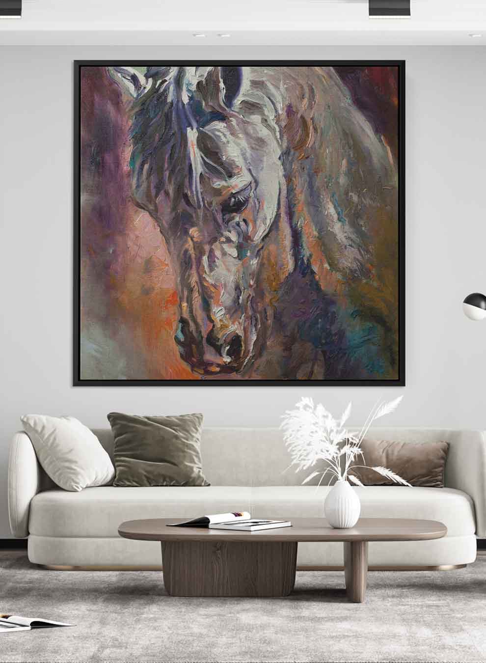 Square Canvas Wall Art Stretched Over Wooden Frame with Brown Floating Frame and Horse Head With Shiny Eyes Painting