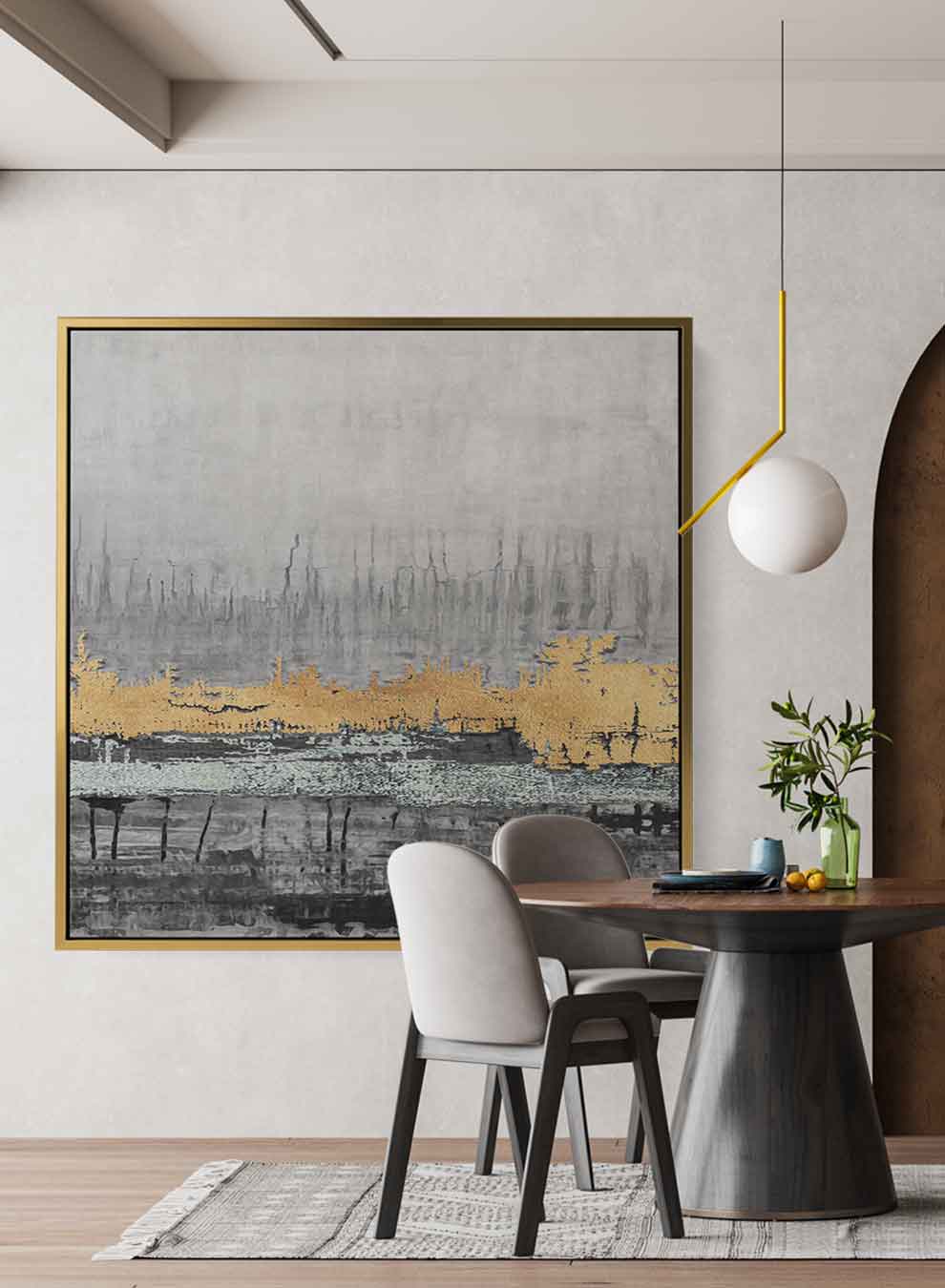 Square Canvas Wall Art Stretched Over Wooden Frame with Gold Floating Frame and Mesmerizing Landscape Painting