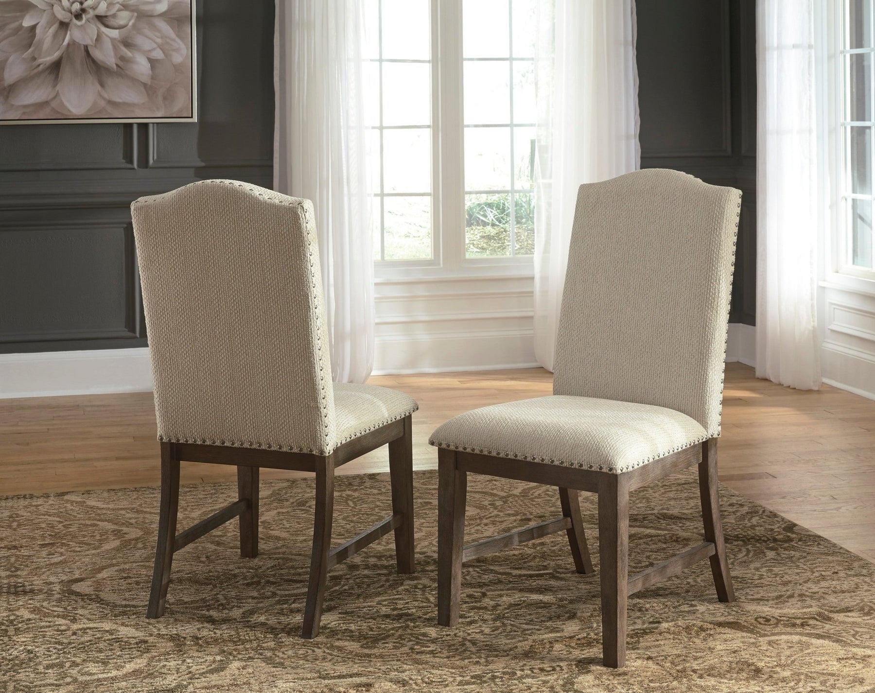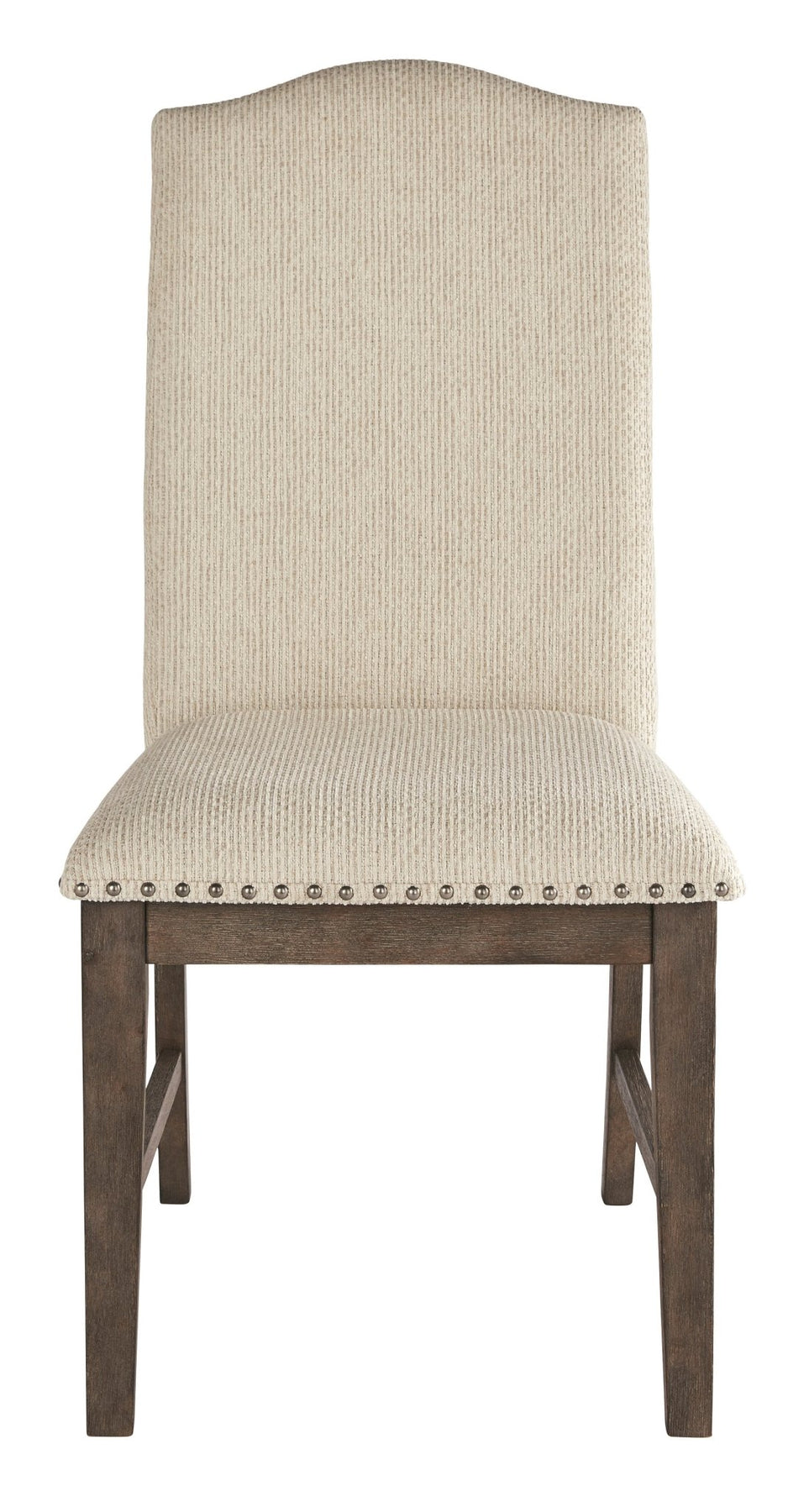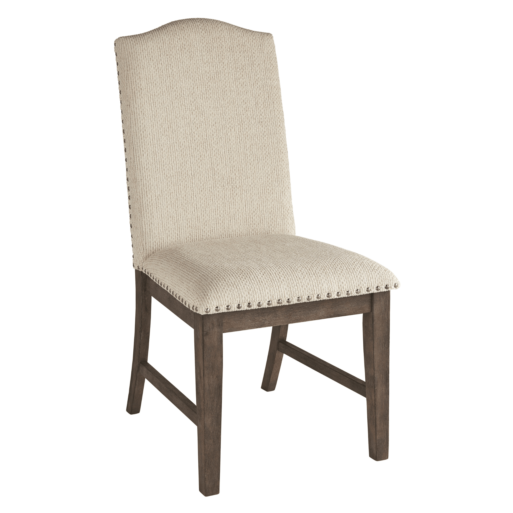 Homey. Hearty. Heavenly hued. Luring with a distressed weathered gray finish with classic camelback flair, the Johnelle dining room upholstered chair is sure to make your homestead feel that much more like home. Fresh and neutral linen-weave upholstery is punctuated with contrasting nailhead trim for added character. Includes adjustable, high-quality levelers attached to the two front legs to ensure stability on uneven surfaces. Use them to eliminate wobble and give your family and guests a comfortable, stable and relaxing dining experience.