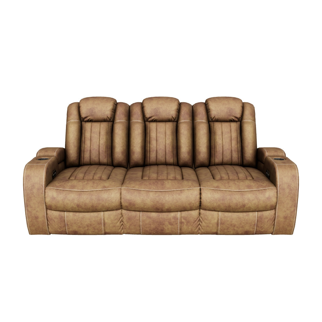 Dual-sided Recliners; middle seat remains stationary;One-touch power control with adjustable positions, Easy View™ adjustable headrest and zero-draw USB port;Zero-draw technology only consumes power when the USB receptacle is in use;Corner-blocked frame with metal reinforced seat;Attached cushions;High-resiliency foam cushions wrapped in thick poly fiber;Faux leather upholstery;Armrests with storage and cup holders;Drop-down table with LED reading lights, dual cup holders, electrical outlet, docking station for wireless charging and 2 USB charging ports;Power cord included; UL Listed,Power Reclining Sofa