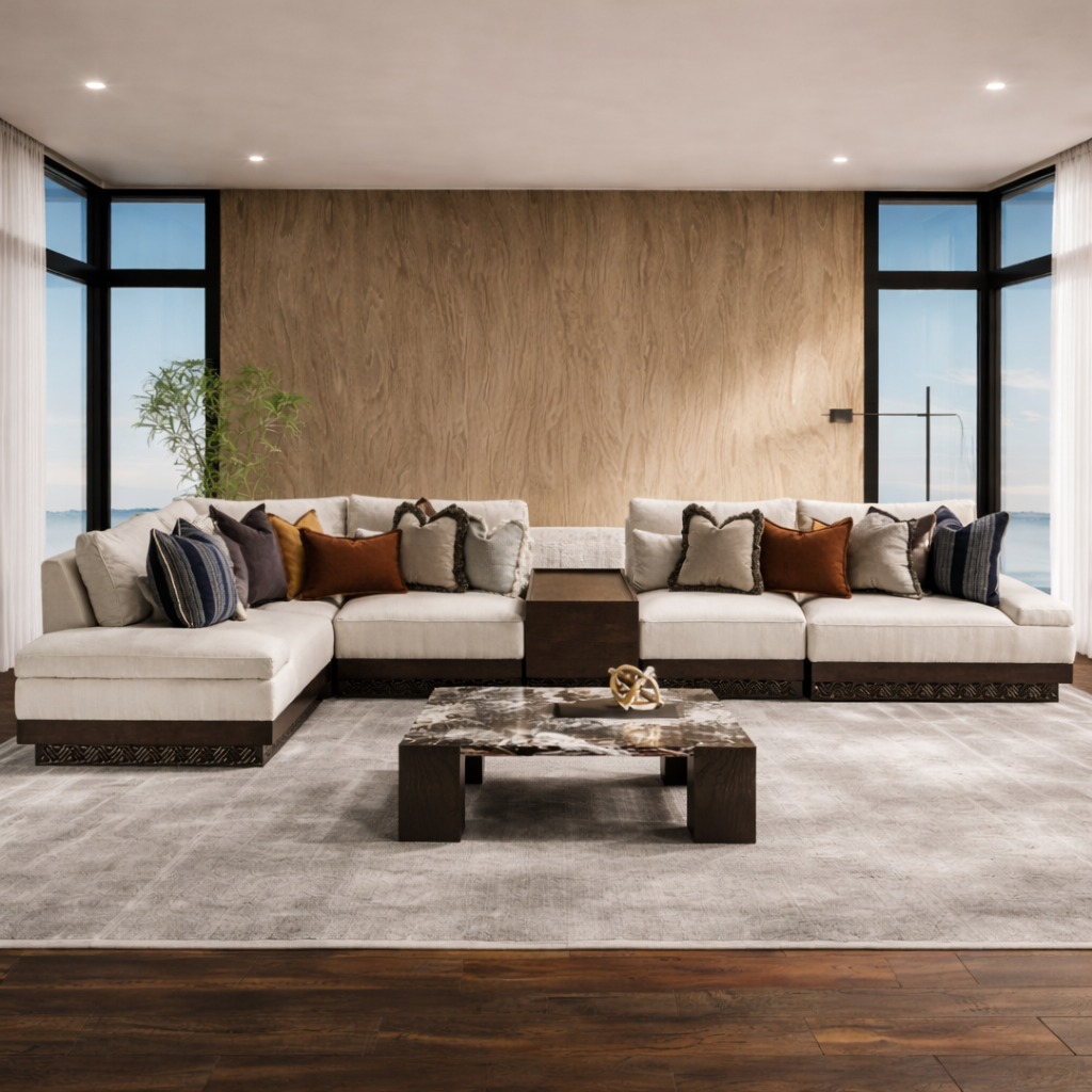 Transform your living space with the Najdi Majlis Modular Sectional, a sophisticated seating solution that seamlessly blends traditional Arabian design with contemporary comfort. This expansive modular system spans 363cm in width and 313cm in depth, offering generous seating for the entire family. The integrated wooden table serves as a functional centerpiece, perfect for serving refreshments or displaying decorative pieces. Crafted with meticulous attention to detail, this majlis-style sectional combines authentic craftsmanship with premium materials, making it an ideal investment for those seeking timeless elegance and practical luxury in their home.