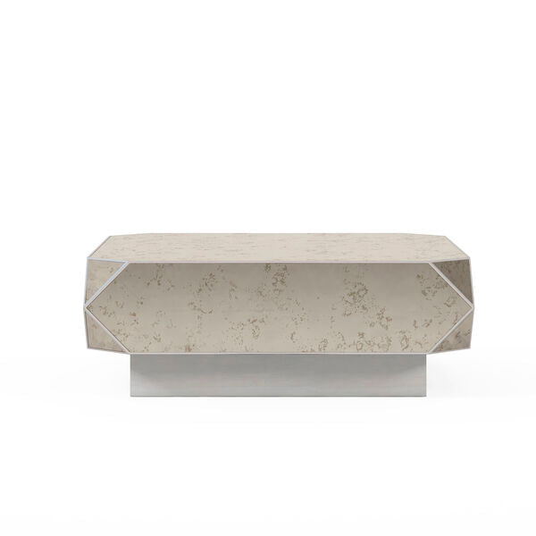 The classic romance of Paris enters the 21st century with this strikingly reflective cocktail table. Its square form is punctuated by faceted corners in triangular shapes, showcasing the beauty of antiqued mirror panes. Modern chic meets timeless warmth in this stunning table, sure to be the shining jewel of any living space.