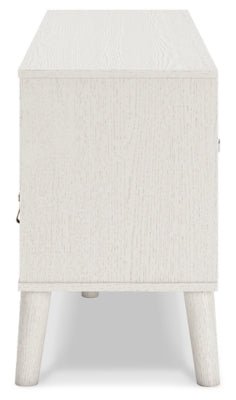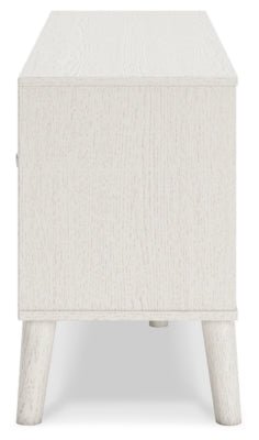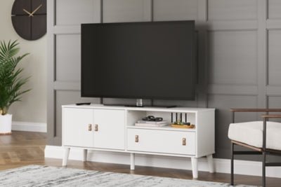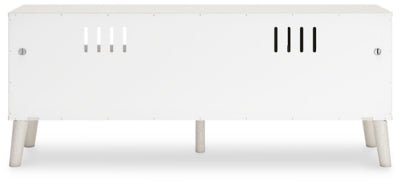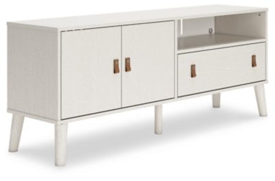 Dare to take minimalism to the max. The Aprilyn TV stand has an air of sleek simplicity thanks to its white painted finish with subtle replicated wood grain. A drawer, open shelf and cabinet provide just the right amount of living room storage, while magnificently mod splay legs compellingly complement the streamlined design. And with two sets of faux leather pulls that allow you to customize the TV stand to suit your space, there's no doubt about it: this contemporary piece is sure to become a classic.